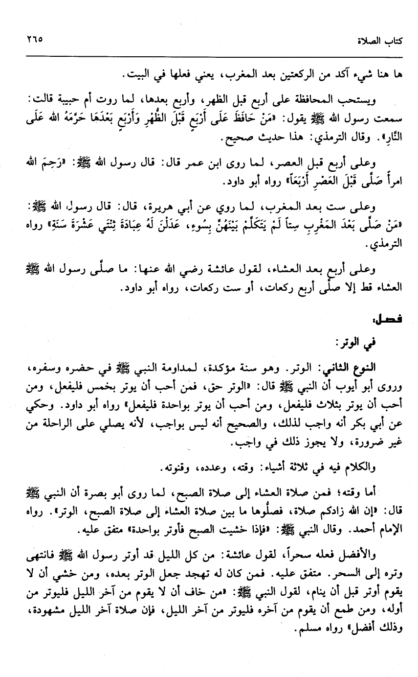 النوع الثاني: الوتر. وهو سنة مؤكدة، لمداومة النبي - صَلَّى اللَّهُ عَلَيْهِ وَسَلَّمَ - في حضره وسفره، وروى أبو أيوب: أن النبي - صَلَّى اللَّهُ عَلَيْهِ وَسَلَّمَ - قال: «الوتر حق، فمن أحب أن يوتر بخمس فليفعل، ومن أحب أن يوتر بثلاث فليفعل، ومن أحب أن يوتر بواحدة فليفعل» رواه أبو داود. وحكي عن أبي بكر أنه واجب لذلك، والصحيح أنه ليس بواجب؛ لأنه يصلى على الراحلة من غير ضرورة، ولا يجوز ذلك في واجب.