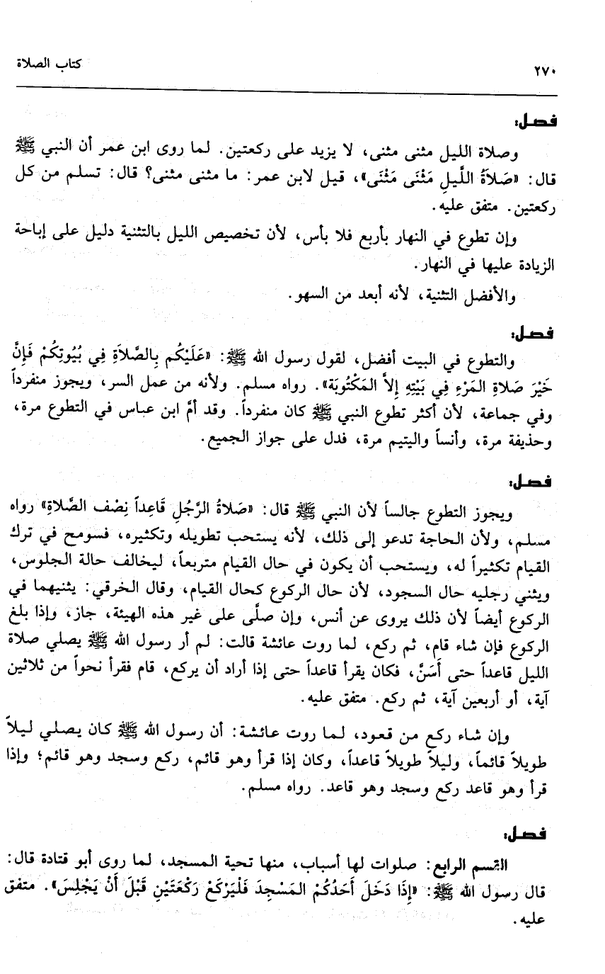القسم الرابع: صلوات لها أسباب، منها تحية المسجد، لما روى أبو قتادة قال: قال رسول الله - صَلَّى اللَّهُ عَلَيْهِ وَسَلَّمَ -: «إذا دخل أحدكم المسجد فليركع ركعتين قبل أن يجلس» متفق عليه.