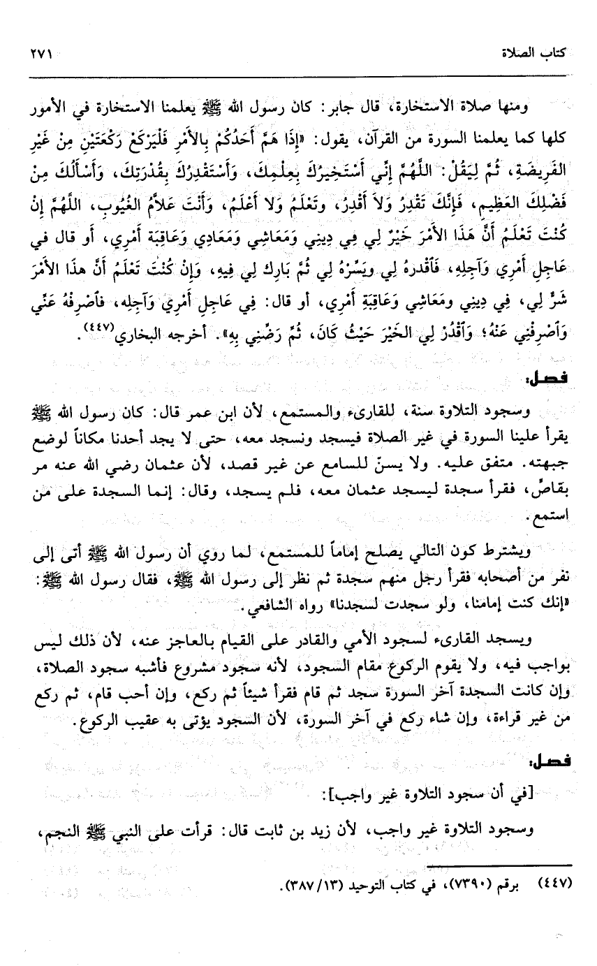 ومنها صلاة الاستخارة، قال جابر: «كان رسول الله - صَلَّى اللَّهُ عَلَيْهِ وَسَلَّمَ - يعلمنا الاستخارة في الأمور كلها كما يعلمنا السورة من القرآن، يقول: إذا هم أحدكم في الأمر؛ فليركع ركعتين من غير الفريضة، ثم ليقل: اللهم إني أستخيرك بعلمك وأستقدرك بقدرتك، وأسألك من فضلك العظيم، فإنك تقدر ولا أقدر، وتعلم ولا أعلم، وأنت علام الغيوب، اللهم إن كنت تعلم أن هذا الأمر خير لي في ديني ومعاشي ومعادي وعاقبة أمري - أو قال: في عاجل أمري وآجله - فاقدره لي، ويسره لي، ثم بارك لي فيه، وإن كنت تعلم أن هذا الأمر شر لي، في ديني ومعاشي وعاقبة أمري - أو قال: في عاجل أمري وآجله - فاصرفه عني، واصرفني عنه، واقدر لي الخير حيث كان، ثم رضني به» أخرجه البخاري.