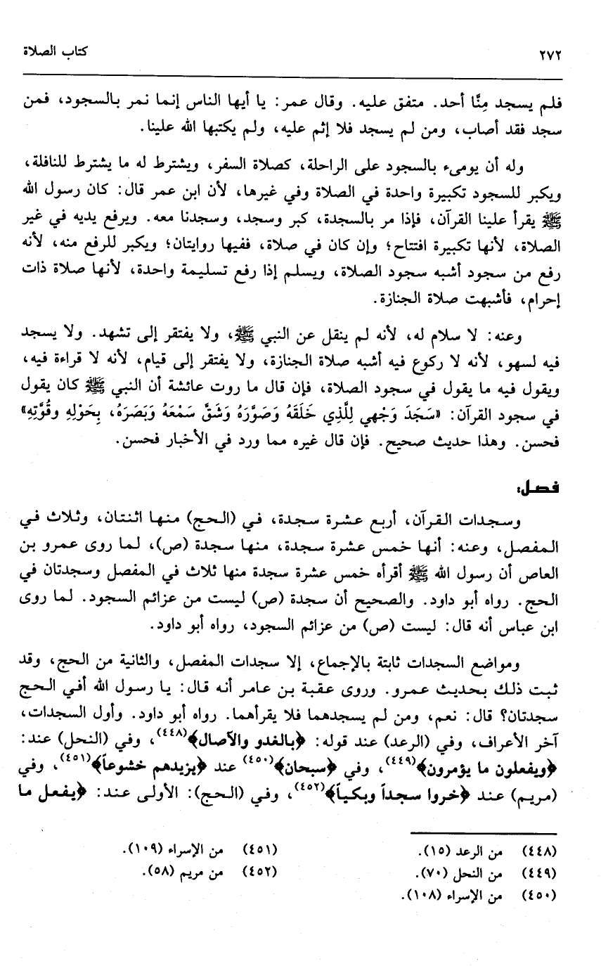 وسجدات القرآن، أربع عشرة سجدة: في (الحج) منها اثنتان، وثلاث في المفصل، وعنه: أنها خمس عشرة سجدة، منها سجدة (ص) ؛ لما «روى عمرو بن العاص أن رسول الله - صَلَّى اللَّهُ عَلَيْهِ وَسَلَّمَ - أقرأه خمس عشرة سجدة؛ منها ثلاث في المفصل، وسجدتان في الحج» رواه أبو داود. والصحيح أن سجدة - صَلَّى اللَّهُ عَلَيْهِ وَسَلَّمَ - ليست من عزائم السجود؛ لما روى ابن عباس أنه قال: ليست (ص) من عزائم السجود رواه أبو داود.