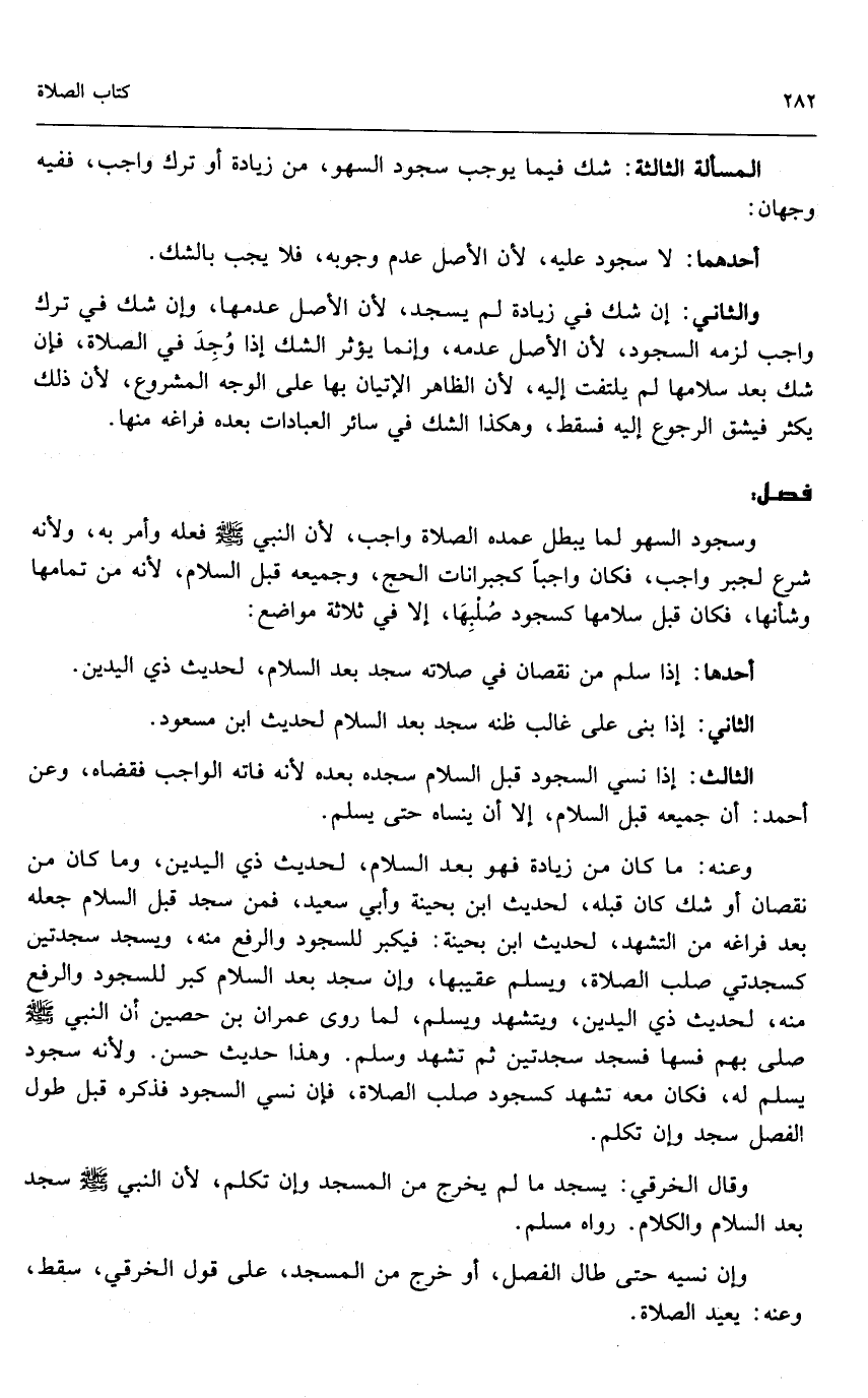 وسجود السهو لما يبطل عمده الصلاة واجب؛ لأن النبي - صَلَّى اللَّهُ عَلَيْهِ وَسَلَّمَ - فعله وأمر به، ولأنه شرع لجبر واجب، فكان واجبًا كجبرانات الحج، وجميعه قبل السلام؛ لأنه من تمامها وشأنها، فكان قبل سلامها كسجود صلبها، إلا في ثلاثة مواضع: