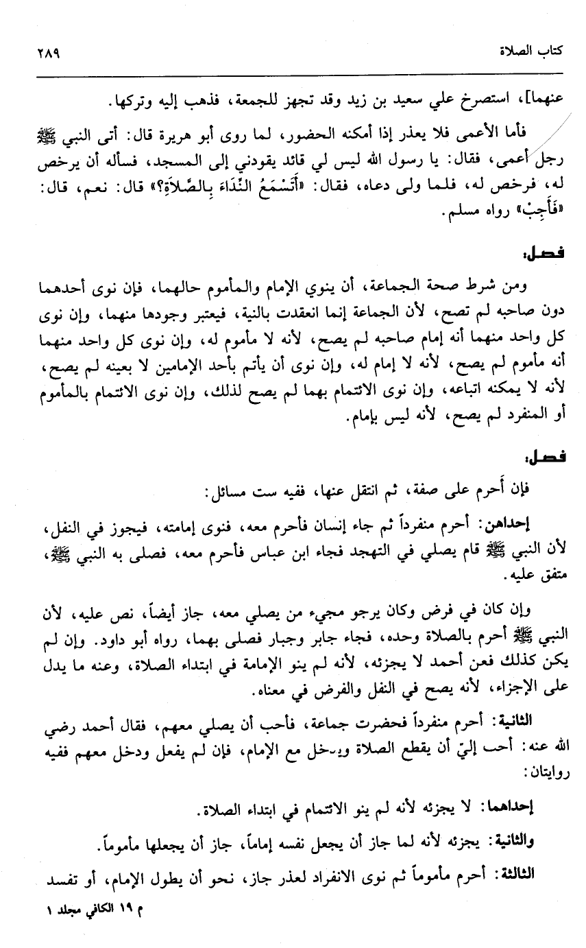 ومن شرط صحة الجماعة أن ينوي الإمام والمأموم حالهما، فإن نوى أحدهما دون صاحبه لم تصح؛ لأن الجماعة إنما انعقدت بالنية، فيعتبر وجودها منهما، وإن نوى كل واحد منهما أنه إمام صاحبه لم يصح؛ لأنه لا مأموم له، وإن نوى كل واحد منهما أنه مأموم لم يصح؛ لأنه لا إمام له، وإن نوى أن يأتم بأحد الإمامين لا بعينه لم يصح؛ لأنه لا يمكنه اتباعه، وإن نوى الائتمام بهما لم يصح لذلك، وإن نوى الائتمام بالمأموم أو المنفرد لم يصح؛ لأنه ليس بإمام.