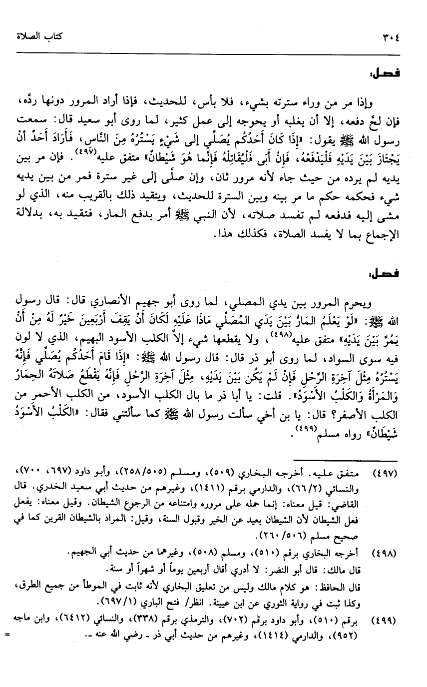 ويحرم المرور بين يدي المصلي؛ لما روى أبو جهيم الأنصاري قال: قال رسول الله - صَلَّى اللَّهُ عَلَيْهِ وَسَلَّمَ -: «لو يعلم المار بين يدي المصلي ماذا عليه لكان أن يقف أربعين خير له من أن يمر بين يديه» متفق عليه. ولا يقطعها شيء إلا الكلب الأسود البهيم، الذي لا لون فيه سوى السواد، لما «روى أبو ذر قال: قال رسول الله - صَلَّى اللَّهُ عَلَيْهِ وَسَلَّمَ -: إذا قام أحدكم يصلي، فإنه يستره مثل آخر الرحل، فإن لم يكن بين يديه، مثل آخرة الرحل، فإنه يقطع صلاته الحمار والمرأة والكلب الأسود قلت: يا أبا ذر، ما بال الكلب الأسود، من الكلب الأحمر، من الكلب الأصفر؟ قال: يا ابن أخي، سألت رسول الله - صَلَّى اللَّهُ عَلَيْهِ وَسَلَّمَ - كما سألتني فقال: الكلب الأسود شيطان» رواه مسلم.