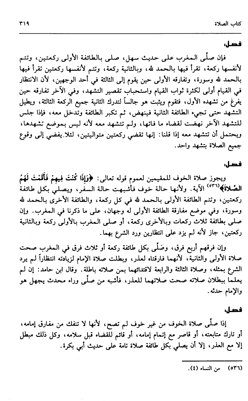 وإن فرقهم أربع فرق، وصلى بكل طائفة ركعة أو ثلاث فرق في المغرب صحت صلاة الأولى والثانية؛ لأنهما فارقتاه لعذر، وبطلت صلاة الإمام لزيادته انتظارًا لم يرد الشرع بمثله، وصلاة الثالثة والرابعة لاقتدائهما بمن صلاته باطلة، وقال ابن حامد: إن لم يعلما ببطلان صلاته صحت صلاتهما للعذر، فأشبه من صلى وراء محدث يجهل هو والإمام حدثه.