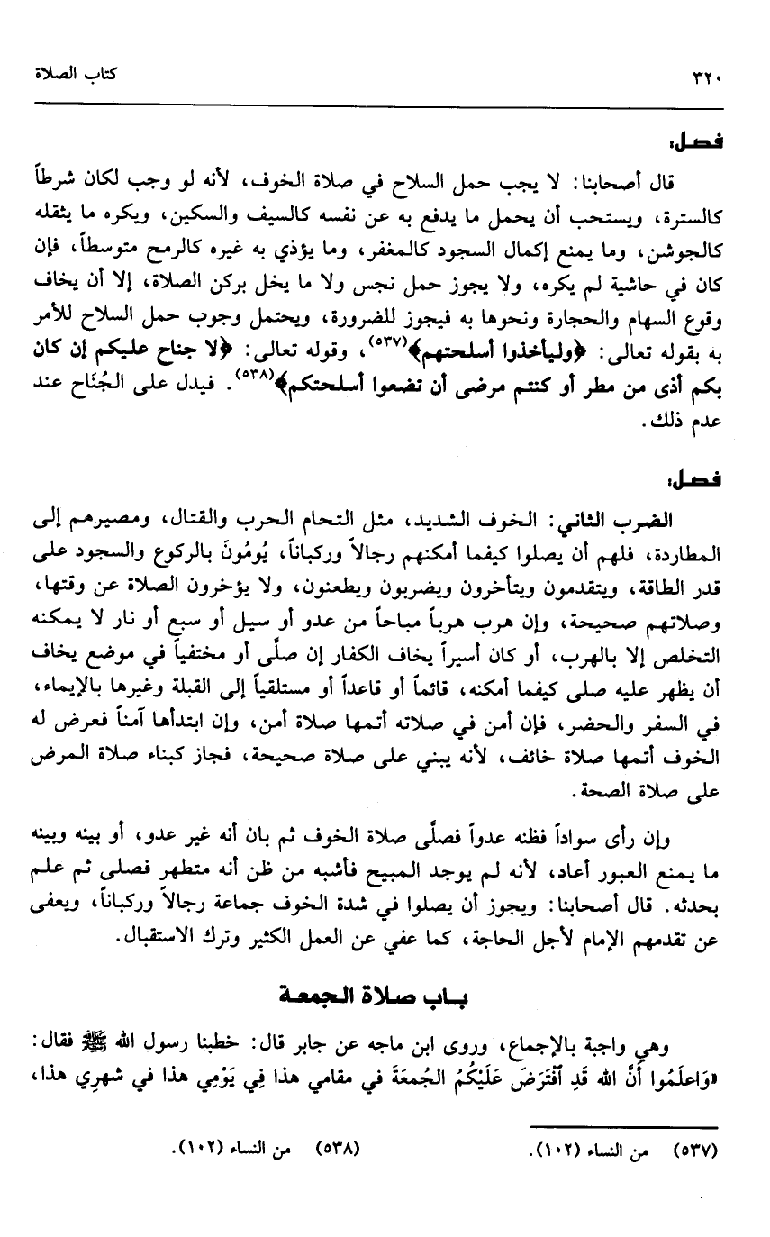 قال أصحابنا: لا يجب حمل السلاح في صلاة الخوف؛ لأنه لو وجب لكان شرطًا كالسترة، ويستحب أن يحمل ما يدفع به عن نفسه كالسيف والسكين، ويكره ما يثقله كالجوشن، وما يمنع إكمال السجود كالمغفر، وما يؤذي به غيره كالرمح متوسطًا، فإن كان في حاشية لم يكره، ولا يجوز حمل نجس ولا ما يخل بركن الصلاة، إلا أن يخاف وقوع السهام والحجارة ونحوها به، فيجوز للضرورة، ويحتمل وجوب حمل السلاح للأمر به بقوله تعالى: {وَلْيَأْخُذُوا أَسْلِحَتَهُمْ} [النساء: 102] ، وقَوْله تَعَالَى: {وَلا جُنَاحَ عَلَيْكُمْ إِنْ كَانَ بِكُمْ أَذًى مِنْ مَطَرٍ أَوْ كُنْتُمْ مَرْضَى أَنْ تَضَعُوا أَسْلِحَتَكُمْ} [النساء: 102] فيدل على الجناح عند عدم ذلك.