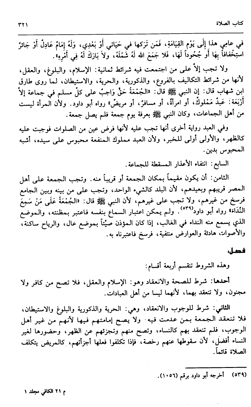 ولا تجب إلا على من اجتمعت فيه شرائط ثمانية: الإسلام، والبلوغ، والعقل؛ لأنها من شرائط التكاليف بالفروع، والذكورية، والحرية، والاستيطان، لما روى طارق بن شهاب قال: إن النبي - صَلَّى اللَّهُ عَلَيْهِ وَسَلَّمَ - قال: «الجمعة حق واجب على كل مسلم في جماعة إلا أربعة: عبد مملوك، أو امرأة، أو مسافر، أو مريض» رواه أبو داود. ولأن المرأة ليست من أهل الجماعات، وكان النبي - صَلَّى اللَّهُ عَلَيْهِ وَسَلَّمَ - بعرفات يوم جمعة فلم يصل جمعة.