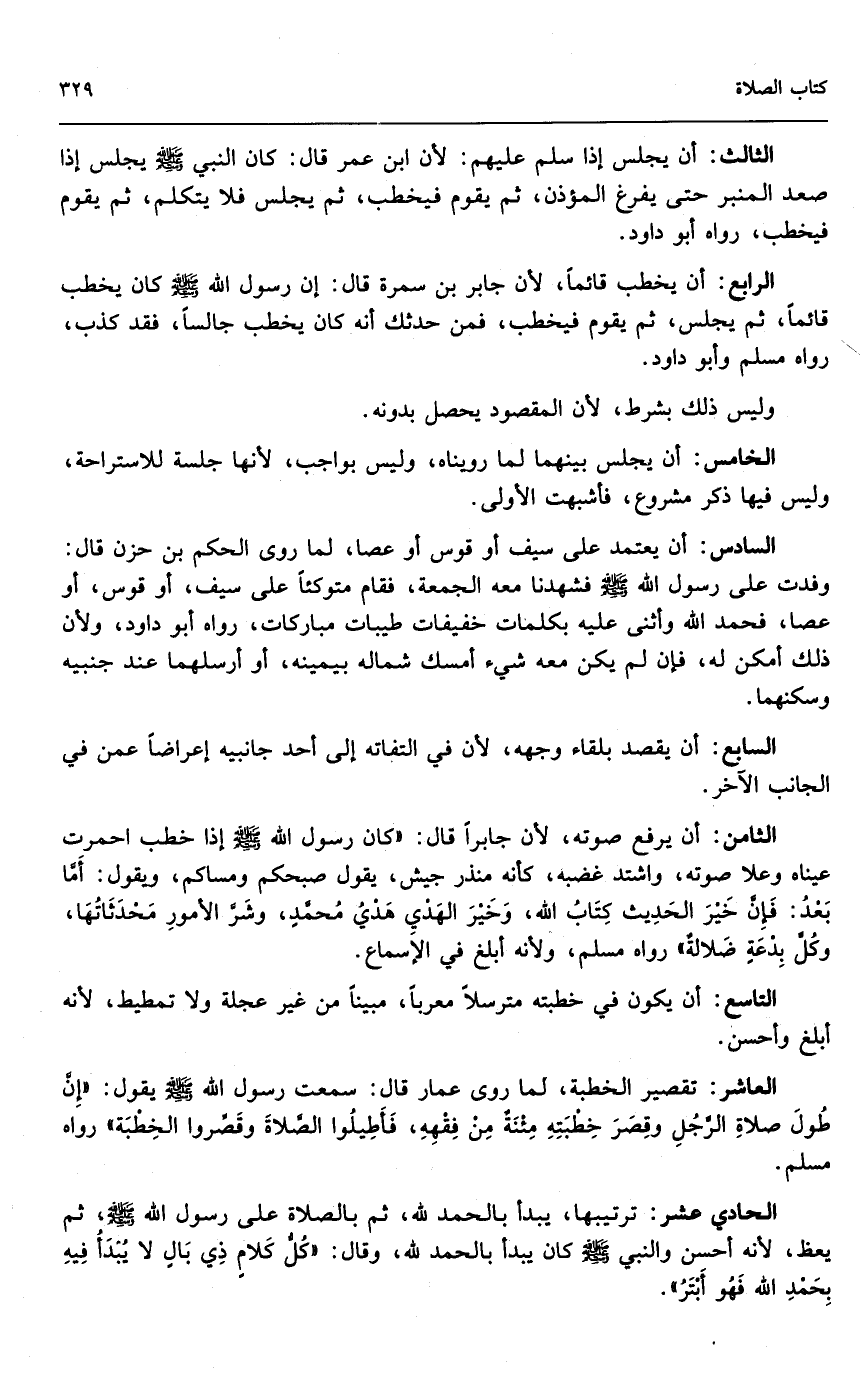 الحادي عشر: ترتيبها، يبدأ بالحمد لله، ثم بالصلاة على رسول الله - صَلَّى اللَّهُ عَلَيْهِ وَسَلَّمَ -، ثم يعظ؛ لأنه أحسن والنبي - صَلَّى اللَّهُ عَلَيْهِ وَسَلَّمَ - كان يبدأ بالحمد لله، وقال: «كل كلام ذي بال لا يبدأ فيه بحمد الله فهو أبتر» .