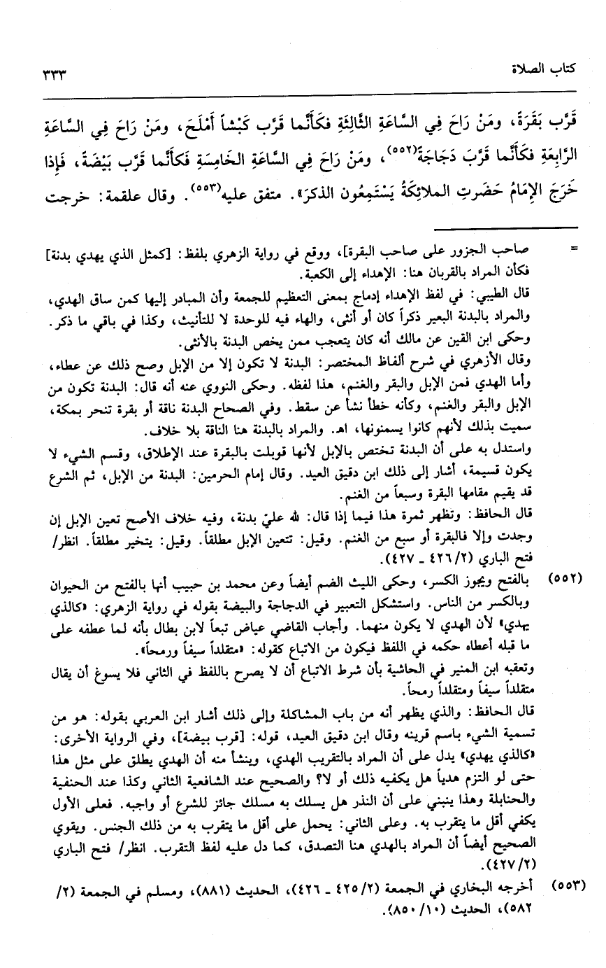 قرب بقرة، ومن راح في الساعة الثالثة فكأنما قرب كبشاً أملح، ومن راح في الساعة الرابعة فكأنما قرب دجاجة، ومن راح في الساعة الخامسة فكأنما قرب بيضة، فإذا خرج الإمام حضرت الملائكة يستمعون الذكر» متفق عليه. وقال علقمة: خرجت