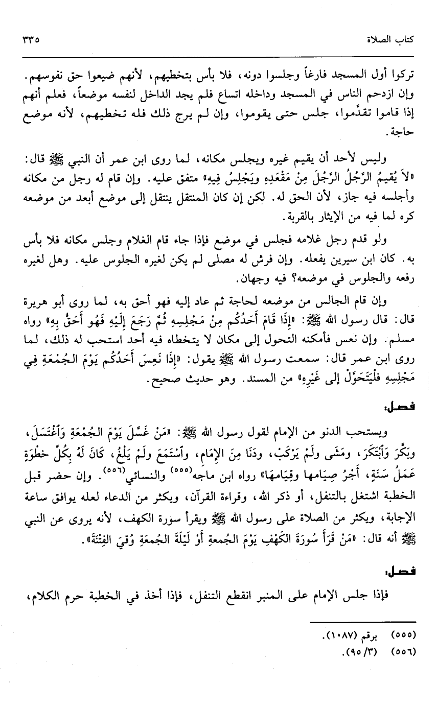 ويستحب الدنو من الإمام لقول رسول الله - صَلَّى اللَّهُ عَلَيْهِ وَسَلَّمَ -: «من غسل يوم الجمعة واغتسل، وبكر وابتكر، ومشى ولم يركب، ودنا من الإمام، واستمع ولم يلغ، كان له بكل خطوة عمل سنة أجر صيامها وقيامها» رواه ابن ماجه والنسائي. وإن حضر قبل الخطبة اشتغل بالتنفل، أو ذكر الله، وقراءة القرآن، ويكثر من الدعاء لعله يوافق ساعة الإجابة، ويكثر من الصلاة على رسول الله - صَلَّى اللَّهُ عَلَيْهِ وَسَلَّمَ - ويقرأ سورة الكهف؛ لأنه يروى عن النبي - صَلَّى اللَّهُ عَلَيْهِ وَسَلَّمَ - أنه قال: «من قرأ سورة الكهف يوم الجمعة أو ليلة الجمعة وقي الفتنة» .