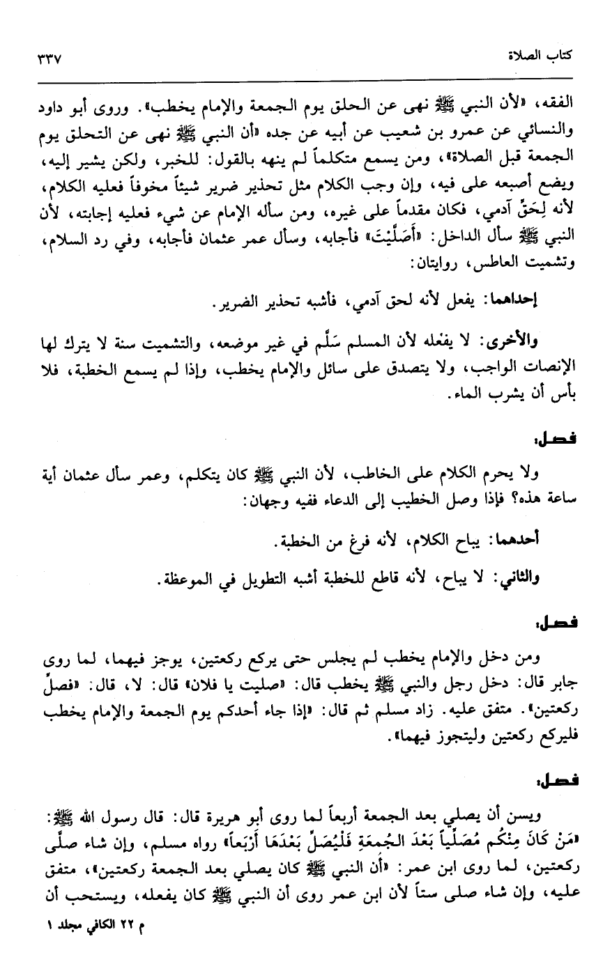 الفقه، «لأن النبي - صَلَّى اللَّهُ عَلَيْهِ وَسَلَّمَ - نهى عن الحلق يوم الجمعة والإمام يخطب» . وروى أبو داود والنسائي عن عمرو بن شعيب عن أبيه عن جده «أن النبي - صَلَّى اللَّهُ عَلَيْهِ وَسَلَّمَ - نهى عن التحلق يوم الجمعة قبل الصلاة» ، ومن يسمع متكلماً لم ينهه بالقول: للخبر، ولكن يشير إليه، ويضع إصبعه على فيه، وإن وجب الكلام مثل تحذير ضرير شيئاً مخوفاً فعليه الكلام؛ لأنه لحق آدمي، فكان مقدماً على غيره، ومن سأله الإمام عن شيء فعليه إجابته؛ لأن النبي - صَلَّى اللَّهُ عَلَيْهِ وَسَلَّمَ - سأل الداخل: أصليت فأجابه، وسأل عمر عثمان فأجابه، وفي رد السلام، وتشميت العاطس، روايتان:
