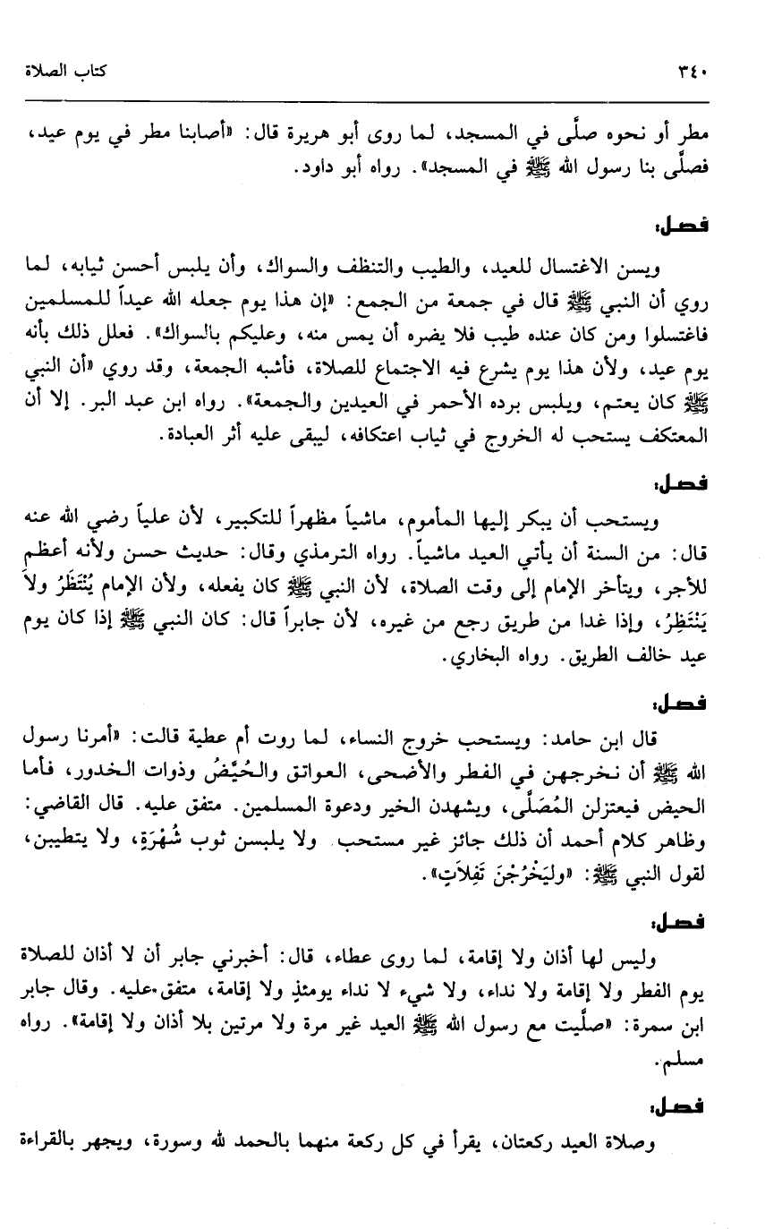 ويسن الاغتسال للعيد، والطيب والتنظيف والسواك، وأن يلبس أحسن ثيابه، لما روي أن النبي - صَلَّى اللَّهُ عَلَيْهِ وَسَلَّمَ - قال في جمعة من الجمع: «إن هذا يوم جعله الله عيداً للمسلمين فاغتسلوا ومن كان عنده طيب فلا يضره أن يمس منه، وعليكم بالسواك» فعلل ذلك بأنه يوم عيد، ولأن هذا اليوم يشرع فيه الاجتماع للصلاة، فأشبه الجمعة، وقد روي «أن النبي - صَلَّى اللَّهُ عَلَيْهِ وَسَلَّمَ - كان يعتم، ويلبس برده الأحمر في العيدين والجمعة» رواه ابن عبد البر. إلا أن المعتكف يستحب له الخروج في ثياب اعتكافه، ليبقى عليه أثر العبادة.