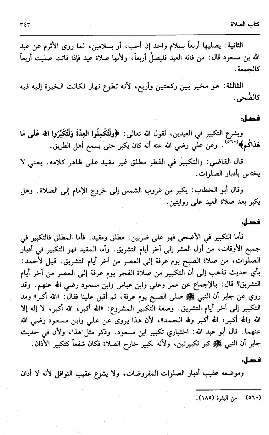 فأما التكبير في الأضحى فهو على ضربين: مطلق ومقيد. فأما المطلق فالتكبير في جميع الأوقات، من أول العشر إلى آخر أيام التشريق. وأما المقيد فهو التكبير في أدبار الصلوات، من صلاة الصبح يوم عرفة إلى العصر من آخر أيام التشريق. قيل لأحمد: بأي حديث تذهب إلى أن التكبير في صلاة الفجر يوم عرفة إلى العصر من آخر أيام التشريق؟ قال: بالإجماع عن عمر وعلي وابن عباس وابن مسعود - رَضِيَ اللَّهُ عَنْهُمْ -. وقد روي عن جابر «أن النبي - صَلَّى اللَّهُ عَلَيْهِ وَسَلَّمَ - صلى الصبح يوم عرفة، ثم أقبل علينا فقال: الله أكبر ومد التكبير إلى آخر أيام التشريق» . وصفة التكبير المشروع: (الله أكبر، الله أكبر، لا إله إلا الله والله أكبر، الله أكبر ولله الحمد) ؛ لأن هذا يروى عن علي وابن مسعود - رَضِيَ اللَّهُ عَنْهُمَا -. قال أبو عبد الله: اختياري تكبير ابن مسعود. وذكر مثل هذا، ولأن في حديث جابر «أن النبي - صَلَّى اللَّهُ عَلَيْهِ وَسَلَّمَ - كبر تكبيرتين» ، ولأنه تكبير خارج الصلاة فكان شفعاً كتكبير الأذان.