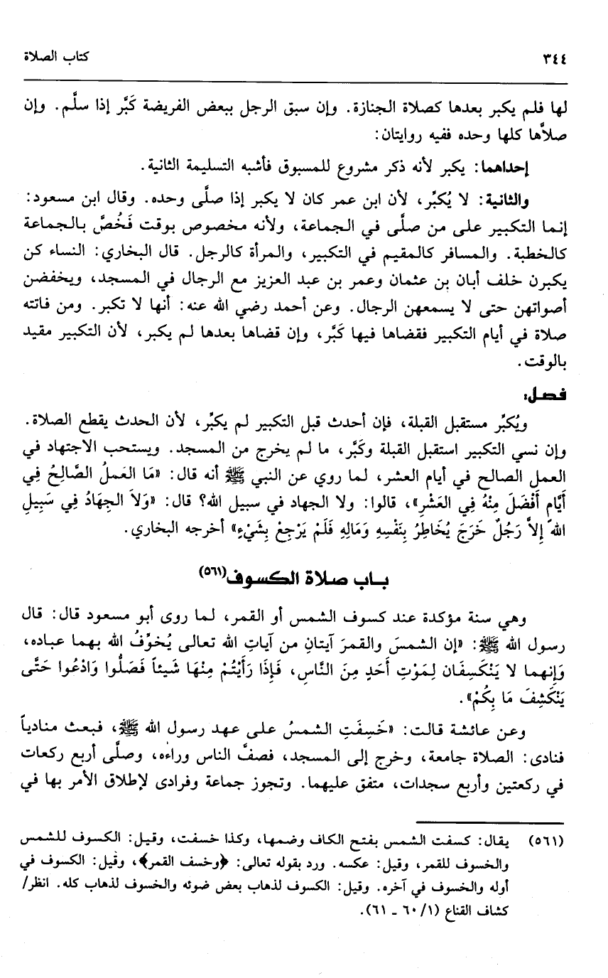 وهي سنة مؤكدة عند كسوف الشمس أو القمر، لما روى أبو مسعود قال: قال رسول الله - صَلَّى اللَّهُ عَلَيْهِ وَسَلَّمَ -: «إن الشمس والقمر آتيان من آيات الله تعالى يخوف الله بهما عباده وإنهما لا ينكسفان لموت أحد من الناس، فإذا رأيتم منها شيئاً فصلوا وادعوا حتى ينكشف ما بكم» وعن عائشة قالت: «خسفت الشمس على عهد رسول الله - صَلَّى اللَّهُ عَلَيْهِ وَسَلَّمَ -، فبعث منادياً فنادى: الصلاة جامعة، وخرج إلى المسجد، فصف الناس وراءه، وصلى أربع ركعات في ركعتين وأربع سجدات» ، متفق عليهما. وتجوز جماعة وفرادى لإطلاق الأمر بهما في