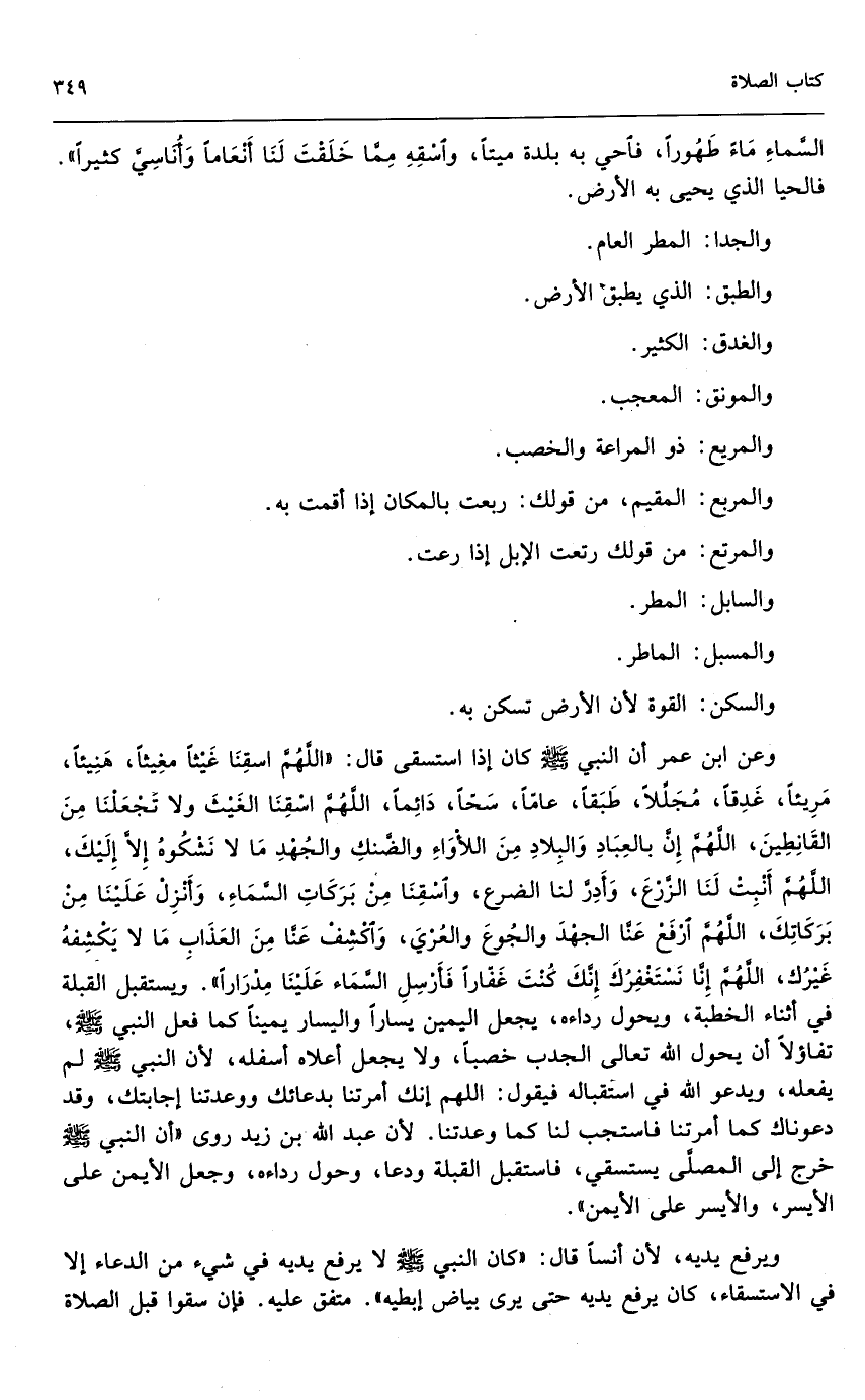 وعن ابن عمر أن النبي - صَلَّى اللَّهُ عَلَيْهِ وَسَلَّمَ - كان إذا استسقى قال: «اللهم اسقنا غيثاً مغيثاً، هنيئاً، مريئاً، غدقاً، مجللاً، طبقاً، عاماً، سحاً، دائماً، اللهم اسقنا الغيث ولا تجعلنا من القانطين، اللهم إن بالعباد والبلاد من اللأواء والضنك والجهد ما لا نشكوه إلا إليك، اللهم أنبت لنا الزرع، وأدر لنا الضرع، واسقنا من بركات السماء، وأنزل علينا من بركاتك، اللهم ارفع عنا الجهد والجوع والعري، واكشف عنا من العذاب ما لا يكشفه غيرك، اللهم إنا نستغفرك إنك كنت غفاراً فأرسل السماء علينا مدراراً» . ويستقبل القبلة في أثناء الخطبة، ويحول رداءه، يجعل اليمين يساراً واليسار يميناً كما فعل النبي - صَلَّى اللَّهُ عَلَيْهِ وَسَلَّمَ - تفاؤلاً أن يحول الله تعالى الجدب خصباً، ولا يجعل أعلاه أسفله؛ لأن النبي - صَلَّى اللَّهُ عَلَيْهِ وَسَلَّمَ - لم يفعله، ويدعو الله في استقباله فيقول: اللهم إنك أمرتنا بدعائك ووعدتنا إجابتك، وقد دعوناك كما أمرتنا فاستجب لنا كما وعدتنا. لأن عبد الله بن زيد روى: «أن النبي - صَلَّى اللَّهُ عَلَيْهِ وَسَلَّمَ - خرج إلى المصلى يستسقي، فاستقبل القبلة ودعا، وحول رداءه وجعل الأيمن على الأيسر، والأيسر على الأيمن» .
