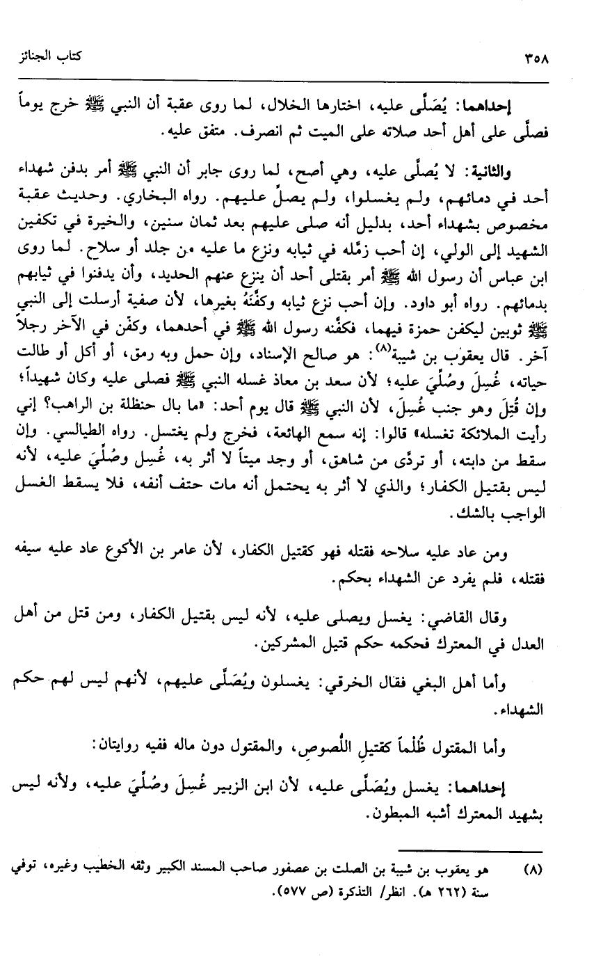 والثانية: لا يصلى عليه، وهي أصح، لما روى جابر «أن النبي - صَلَّى اللَّهُ عَلَيْهِ وَسَلَّمَ - أمر بدفن شهداء أحد في دمائهم، ولم يغسلوا، ولم يصل عليهم» . رواه البخاري. وحديث عقبة مخصوص بشهداء أحد، بدليل أنه صلى عليهم بعد ثمان سنين، والخيرة في تكفين الشهداء إلى الولي، إن أحب زمله في ثيابه ونزع ما عليه من جلد أو سلاح. لما روى ابن عباس «أن رسول - صَلَّى اللَّهُ عَلَيْهِ وَسَلَّمَ - أمر بقتلى أحد أن ينزع عنهم الحديد، وأن يدفنوا في ثيابهم بدمائهم» . رواه أبو داود. وإن أحب نزع ثيابه وكفنه بغيرها؛ «لأن صفية أرسلت إلى النبي - صَلَّى اللَّهُ عَلَيْهِ وَسَلَّمَ - ثوبين ليكفن حمزة فيهما، فكفنه رسول الله - صَلَّى اللَّهُ عَلَيْهِ وَسَلَّمَ - في أحدهما، وكفن في الآخر رجلاً آخر» . قال يعقوب بن شيبة: هو صالح الإسناد، وإن حمل وبه رمق، أو أكل أو طالت حياته، غسل وصلي عليه؛ لأن سعد بن معاذ غسله النبي - صَلَّى اللَّهُ عَلَيْهِ وَسَلَّمَ - فصلى عليه وكان شهيداً، وإن قتل وهو جنب غسل؛ لأن النبي - صَلَّى اللَّهُ عَلَيْهِ وَسَلَّمَ - قال يوم أحد: «ما بال حنظلة بن الراهب؟ إني رأيت الملائكة تغسله قالوا: إنه سمع الهائعة، فخرج ولم يغتسل» . رواه الطيالسي. وإن سقط من دابته، أو تردى من شاهق، أو وجد ميتاً لا أثر به، غسل وصلي عليه؛ لأنه ليس بقتيل الكفار، والذي لا أثر به يحتمل أنه مات حتف أنفه، فلا يسقط الغسل الواجب بالشك.