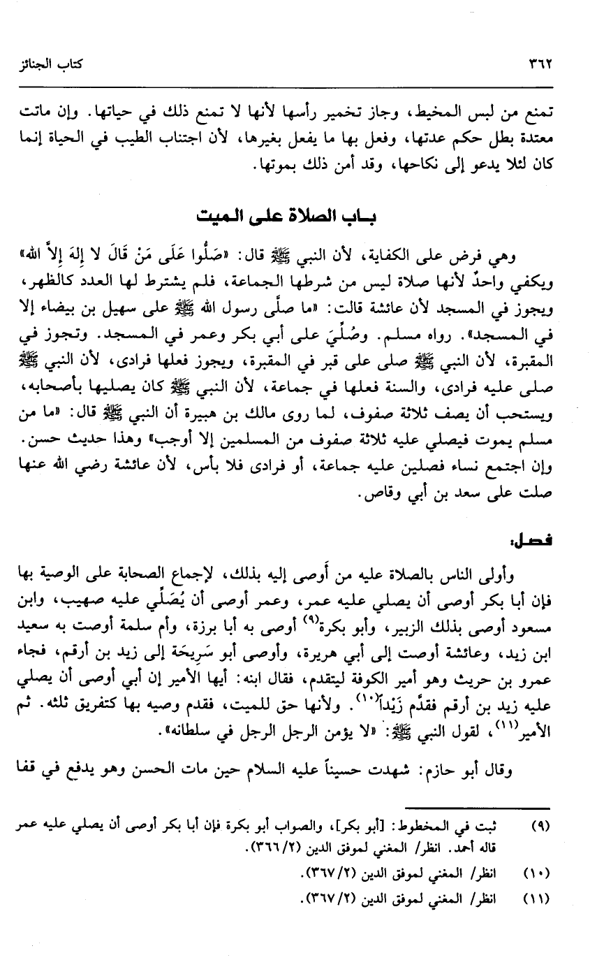 وهي فرض على الكفاية؛ لأن النبي - صَلَّى اللَّهُ عَلَيْهِ وَسَلَّمَ - قال: «صلوا على من قال لا إله إلا الله» ويكفي واحد لأنها صلاة ليس من شرطها الجماعة، فلم يشترط لها العدد كالظهر، ويجوز في المسجد لأن عائشة قالت: «ما صلى رسول الله - صَلَّى اللَّهُ عَلَيْهِ وَسَلَّمَ - على سهيل بن بيضاء إلا في المسجد» . رواه مسلم. وصلي على أبي بكر وعمر في المسجد. وتجوز في المقبرة؛ لأن النبي - صَلَّى اللَّهُ عَلَيْهِ وَسَلَّمَ - صلى على قبر في المقبرة، ويجوز فعلها فرادى؛ لأن النبي - صَلَّى اللَّهُ عَلَيْهِ وَسَلَّمَ - صلى عليه فرادى، والسنة فعلها في جماعة؛ لأن النبي - صَلَّى اللَّهُ عَلَيْهِ وَسَلَّمَ - كان يصليها بأصحابه، ويستحب أن يصف ثلاثة صفوف لما روى مالك بن هبيرة أن النبي - صَلَّى اللَّهُ عَلَيْهِ وَسَلَّمَ - قال: «ما من مسلم يموت فيصلى عليه ثلاث صفوف من المسلمين إلا أوجب» وهذا حديث حسن. وإن اجتمع نساء فصلين عليه جماعة، أو فرادى فلا بأس؛ لأن عائشة - رَضِيَ اللَّهُ عَنْهَا - صلت على سعد بن أبي وقاص.
