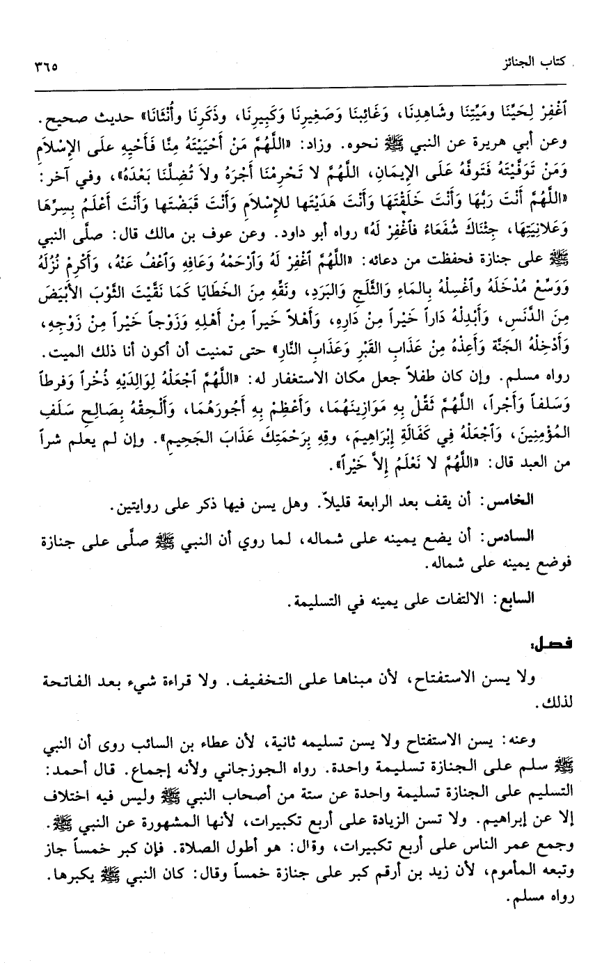 وعن أبي هريرة عن النبي - صَلَّى اللَّهُ عَلَيْهِ وَسَلَّمَ - نحوه. وزاد: «اللهم من أحييته منا فأحييه على الإسلام ومن توفيته فتوفه على الإيمان، اللهم لا تحرمنا أجره ولا تضلنا بعده» وفي آخر: «اللهم أنت ربها وأنت خلقتها وأنت هديتها للإسلام وأنت قبضتها وأنت أعلم بسرها وعلانيتها، جئناك شفعاء فاغفر له» رواه أبو داود. وعن عوف بن مالك قال: «صلى النبي - صَلَّى اللَّهُ عَلَيْهِ وَسَلَّمَ - على جنازة فحفظت من دعائه: الله اغفر له وارحمه وعافه واعف عنه، وأكرم نزله ووسع مدخله واغسله بالماء والثلج والبرد، ونقه من الخطايا كما نقيت الثوب الأبيض من الدنس، وأبدله داراً خيراً من داره، وأهلاً خيراً من أهله وزوجاً خيراً من زوجه، وأدخله الجنة وأعذه من عذاب القبر وعذاب النار حتى تمنيت أن أكون أنا ذلك الميت» . رواه مسلم. وإن كان طفلاً جعل مكان الاستغفار له: «اللهم اجعله لوالديه ذخراً وفرطاً وسلفاً وأجراً، اللهم ثقل به موازينهما، وأعظم به أجورهما، وألحقه بصالح سلف المؤمنين، واجعله في كفالة إبراهيم، وقه برحمتك عذاب الجحيم» وإن لم يعلم شراً من العبد قال: «اللهم لا نعلم إلا خيراً»