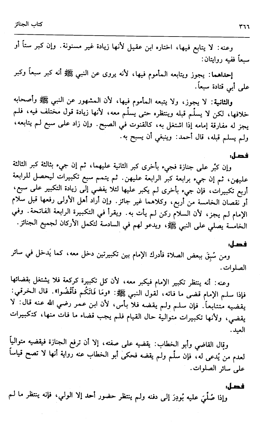 وإن كبر على جنازة فجيء بأخرى كبر الثانية عليهما، ثم إن جيء بثالثة كبر الثالثة عليهن، ثم إن جيء برابعة كبر الرابعة عليهن، ثم يتمم سبع تكبيرات ليحصل للرابعة أربع تكبيرات، فإن جيء بأخرى لم يكبر عليها لئلا يفضي إلى زيادة التكبير على سبع، أو نقصان الخامسة من أربع، وكلاهما غير جائز. وإن أراد أهل الأولى رفعها قبل سلام الإمام لم يجز؛ لأن السلام ركن لم يأت به. ويقرأ في التكبيرة الرابعة الفاتحة. وفي الخامسة يصلي على النبي - صَلَّى اللَّهُ عَلَيْهِ وَسَلَّمَ -، ويدعو لهم في السادسة لتكمل الأركان لجميع الجنائز.