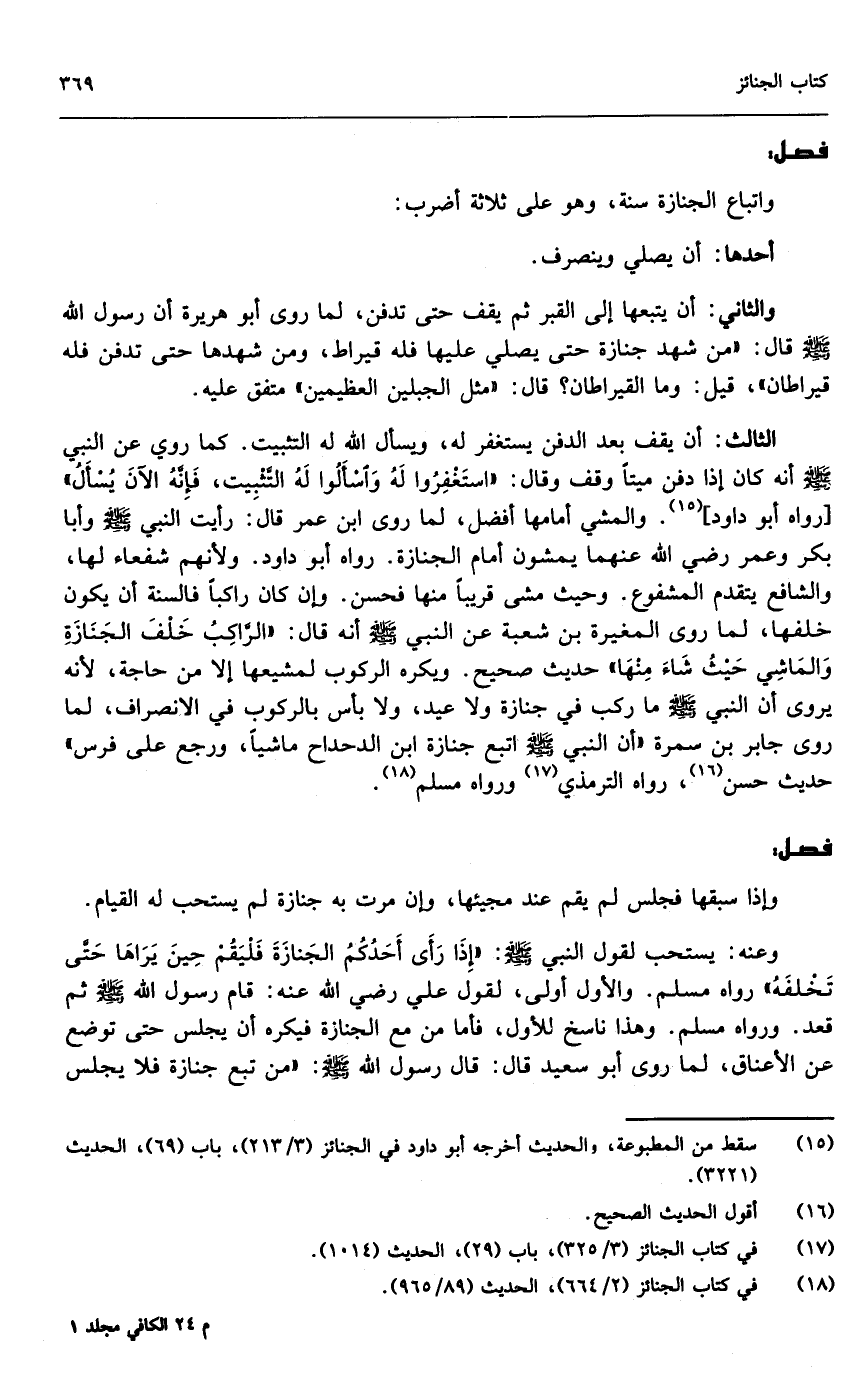 وعنه: يستحب لقول النبي - صَلَّى اللَّهُ عَلَيْهِ وَسَلَّمَ -: «إذا رأى أحدكم الجنازة فليقم حين يراها حتى تخلفه» رواه مسلم. والأول أولى، لقول علي - رَضِيَ اللَّهُ عَنْهُ -: «قام رسول الله - صَلَّى اللَّهُ عَلَيْهِ وَسَلَّمَ - ثم قعد» ، ورواه مسلم. وهذا ناسخ للأول، فأما من مع الجنازة فيكره أن يجلس حتى توضع عن الأعناق، لما روى أبو سعيد قال: قال رسول الله - صَلَّى اللَّهُ عَلَيْهِ وَسَلَّمَ -: «من تبع جنازة فلا يجلس