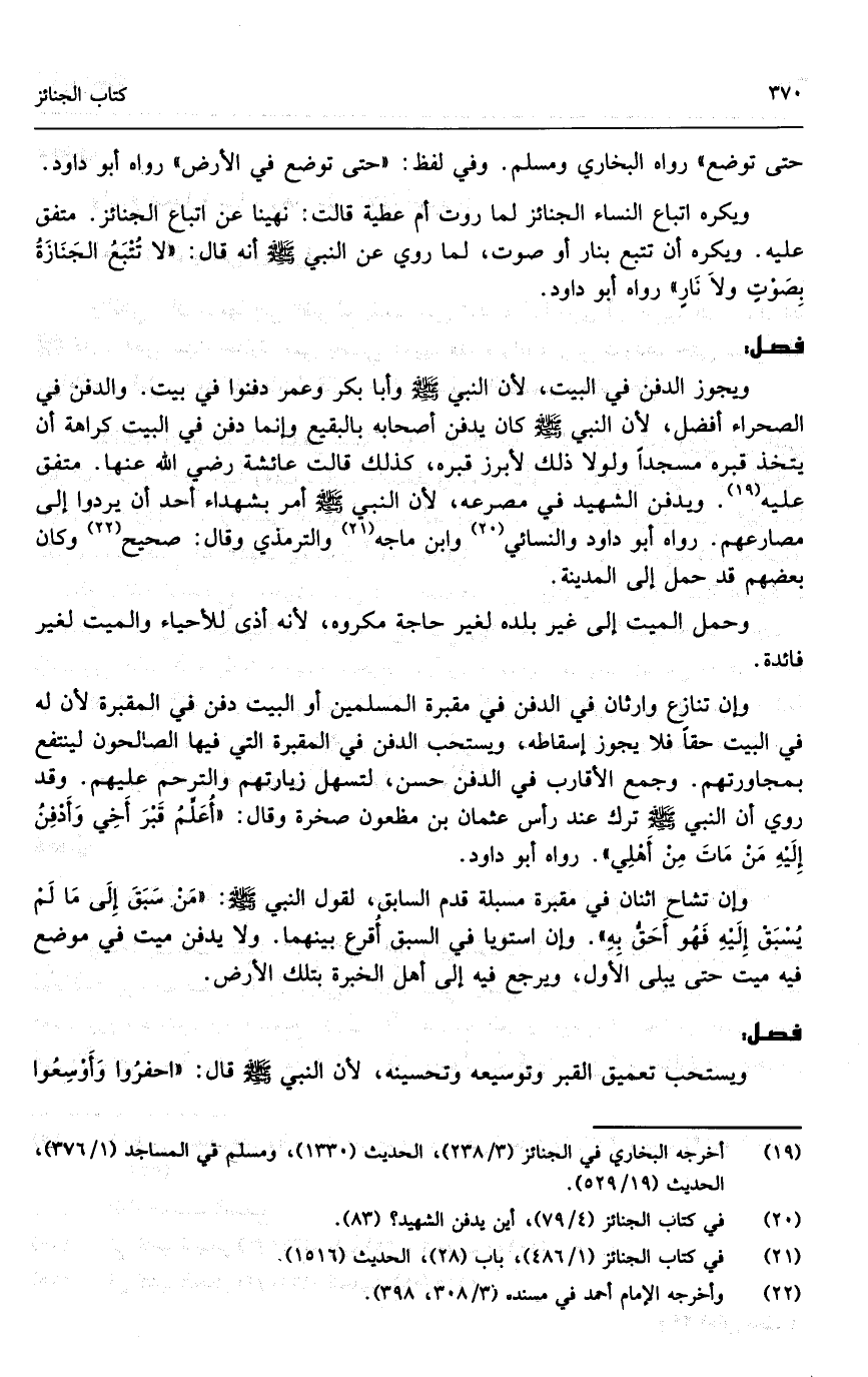 ويجوز الدفن في البيت؛ لأن النبي - صَلَّى اللَّهُ عَلَيْهِ وَسَلَّمَ - وأبا بكر وعمر دفنوا في بيت. والدفن في الصحراء أفضل؛ لأن النبي - صَلَّى اللَّهُ عَلَيْهِ وَسَلَّمَ - كان يدفن أصحابه بالبقيع وإنما دفن في البيت كراهة أن يتخذ قبره مسجداً ولولا ذلك لأبرز قبره، كذلك قالت عائشة - رَضِيَ اللَّهُ عَنْهَا -. متفق عليه. ويدفن الشهيد في مصرعه؛ «لأن النبي - صَلَّى اللَّهُ عَلَيْهِ وَسَلَّمَ - أمر بشهداء أحد أن يردوا إلى مصارعهم» رواه أبو داود والنسائي وابن ماجه والترمذي وقال: صحيح وكان بعضهم قد حمل إلى المدينة.