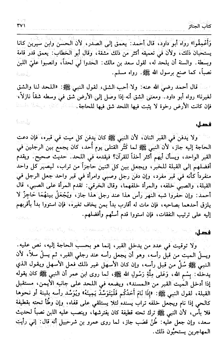 ولا يدفن في القبر اثنان؛ لأن النبي - صَلَّى اللَّهُ عَلَيْهِ وَسَلَّمَ - كان يدفن كل ميت في قبره، فإن دعت الحاجة إليه جاز؛ لأن النبي - صَلَّى اللَّهُ عَلَيْهِ وَسَلَّمَ - «لما كثر القتلى يوم أحد، كان يجمع بين الرجلين في القبر الواحد، ويسأل أيهم أكثر أخذاً للقرآن؟ فيقدمه في اللحد» . حديث صحيح. ويقدم أفضلهم إلى القبلة للخبر، ويجعل بين كل اثنين حاجزاً من تراب، ليصير كل واحد منفرداً كأنه في قبر منفرد، وإن دفن رجل وصبي وامرأة في قبر واحد جعل الرجل في القبلة، والصبي خلفه، والمرأة خلفهما، وقال الخرقي: تقدم المرأة على الصبي، وقال أحمد: وإن حفروا شبه النهر رأس هذا عند رجل هذا جاز، ويجعل بينهما حاجز لا يلصق أحدهما بصاحبه، فإن مات له أقارب بدأ بمن يخاف تغيره، فإن استووا بدأ بأقربهم إليه على ترتيب النفقات، فإن استووا قدم أسنهم وأفضلهم.