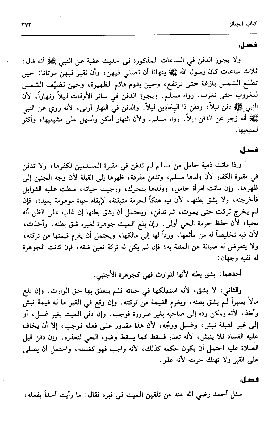 ولا يجوز الدفن في الساعات المذكورة في حديث عقبة عن النبي - صَلَّى اللَّهُ عَلَيْهِ وَسَلَّمَ - أنه قال: «ثلاث ساعات كان رسول الله - صَلَّى اللَّهُ عَلَيْهِ وَسَلَّمَ - ينهانا أن نصلي فيهن، وأن نقبر فيهن موتانا: حين تطلع الشمس بازغة حتى ترتفع، وحين يقوم قائم الظهيرة، وحين تضيف الشمس للغروب حتى تغرب» . رواه مسلم. ويجوز الدفن في سائر الأوقات ليلاً ونهاراً؛ لأن النبي - صَلَّى اللَّهُ عَلَيْهِ وَسَلَّمَ - دفن ليلاً، ودفن ذا البجادين ليلاً. والدفن في النهار أولى؛ لأنه روي عن النبي - صَلَّى اللَّهُ عَلَيْهِ وَسَلَّمَ - أنه زجر عن الدفن ليلاً. رواه مسلم. ولأن النهار أمكن وأسهل على مشيعيها، وأكثر لمتبعيها.