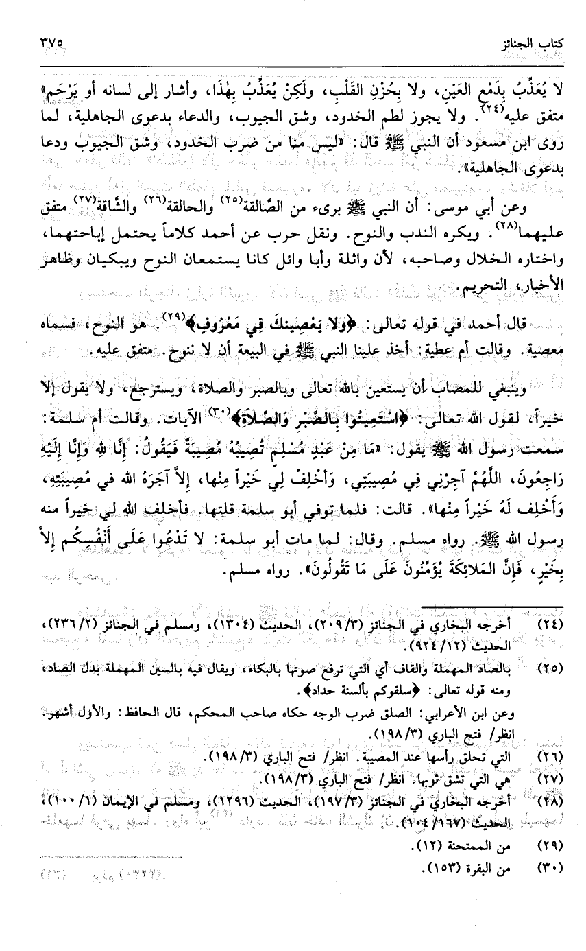 قال أحمد في قَوْله تَعَالَى: {وَلا يَعْصِينَكَ فِي مَعْرُوفٍ} [الممتحنة: 12] . هو النوح، فسماه معصية. وقالت أم عطية: «أخذ علينا النبي - صَلَّى اللَّهُ عَلَيْهِ وَسَلَّمَ - في البيعة أن لا ننوح» . متفق عليه.