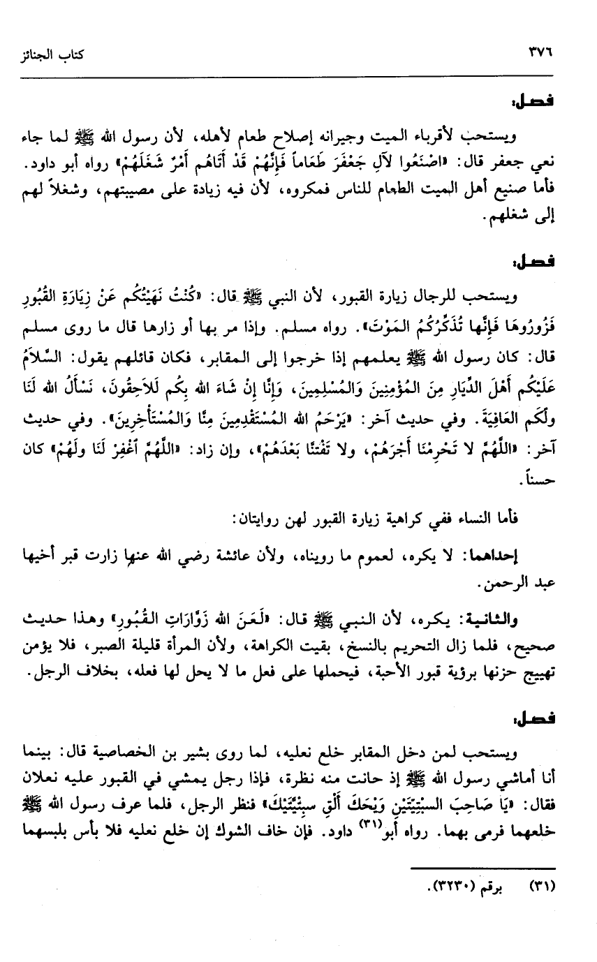ويستحب للرجال زيارة القبور؛ لأن النبي - صَلَّى اللَّهُ عَلَيْهِ وَسَلَّمَ - قال: «كنت نهيتكم عن زيارة القبور فزوروها إنها تذكركم الموت» رواه مسلم. وإن مر بها أو زارها قال ما روى مسلم قال: «كان رسول الله - صَلَّى اللَّهُ عَلَيْهِ وَسَلَّمَ - يعلمهم إذا خرجوا إلى المقابر، فكان قائلهم يقول: السلام عليكم أهل الديار من المؤمنين والمسلمين، وإن شاء الله بكم للاحقون، نسأل الله لنا ولكم العافية» . وفي حديث آخر: «يرحم الله المستقدمين منا والمستأخرين» وفي حديث آخر: «اللهم لا تحرمنا أجرهم، ولا تفتنا بعدهم» ، وإن زاد: «اللهم اغفر لنا ولهم» كان حسناً.