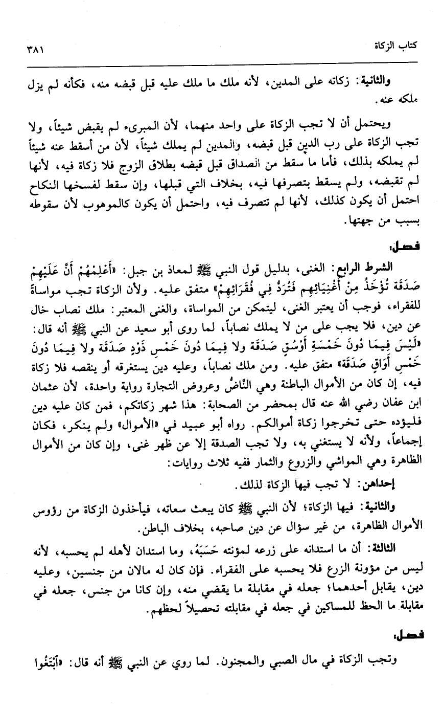 الشرط الرابع: الغنى، بدليل قول النبي - صَلَّى اللَّهُ عَلَيْهِ وَسَلَّمَ - لمعاذ بن جبل: «أعلمهم أن عليهم صدقة تؤخذ من أغنيائهم فترد في فقرائهم» متفق عليه؛ ولأن الزكاة تجب مواساة للفقراء، فوجب أن يعتبر الغنى، ليتمكن من المواساة، والغنى المعتبر: ملك نصاب خال عن دين، فلا يجب على من لا يملك نصاباً، لما روى أبو سعيد عن النبي - صَلَّى اللَّهُ عَلَيْهِ وَسَلَّمَ - أنه قال: «ليس فيما دون خمسة أوسق صدقة ولا فيما دون خمسة ذود صدقة ولا فيما دون خمسة أواق صدقة» متفق عليه. ومن ملك نصاباً، وعليه دين يستغرقه أو ينقصه فلا زكاة فيه، إن كان من الأموال الباطنة وهي الناضّ وعروض التجارة رواية واحدة؛ لأن عثمان بن عفان - رَضِيَ اللَّهُ عَنْهُ - قال بمحضر من الصحابة: هذا شهر زكاتكم، فمن كان عليه دين فليؤده حتى تخرجوا زكاة أموالكم. رواه أبو عبيد في الأموال ولم ينكر، فكان إجماعاً؛ ولأنه لا يستغني به، ولا تجب الصدقة إلا عن ظهر غنى، وإن كان من الأموال الظاهرة وهي المواشي والزروع والثمار ففيه ثلاث روايات: