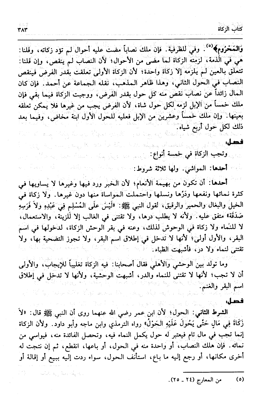 وفي للظرفية. فإن ملك نصاباً مضت عليه أحوال لم تؤد زكاته، وقلنا: هي في الذمة، لزمته الزكاة لما مضى من الأحوال؛ لأن النصاب لم ينقص، وإن قلنا: تتعلق بالعين لم يلزمه إلا زكاة واحدة؛ لأن الزكاة الأولى تعلقت بقدر الفرض فينقص النصاب في الحول الثاني، وهذا ظاهر المذهب، نقله الجماعة عن أحمد. فإن كان المال زائداً عن نصاب نقص منه كل حول بقدر الفرض، ووجبت الزكاة فيما بقي، فإن ملك خمساً من الإبل لزمه لكل حول شاة؛ لأن الفرض يجب من غيرها فلا يمكن تعلقه بعينها. وإن ملك خمساً وعشرين من الإبل فعليه للحول الأول ابنة مخاض، وفيما بعد ذلك لكل حول أربع شياه.