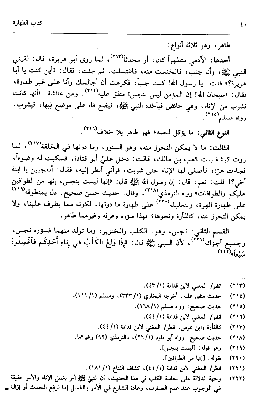 أحدها: الآدمي متطهراً كان، أو محدثاً، لما روى أبو هريرة، قال: «لقيني النبي - صَلَّى اللَّهُ عَلَيْهِ وَسَلَّمَ - وأنا جنب فانخنست منه، فاغتسلت، ثم جئت، فقال: أين كنت يا أبا هريرة؟ قلت: يا رسول الله ! كنت جنباً، فكرهت أن أجالسك وأنا على غير طهارة، فقال: سبحان الله! إن المؤمن ليس بنجس» متفق عليه. وعن عائشة: «أنها كانت تشرب من الإناء، وهي حائض فيأخذه النبي - صَلَّى اللَّهُ عَلَيْهِ وَسَلَّمَ - فيضع فاه على موضع فيها فيشرب» رواه مسلم.