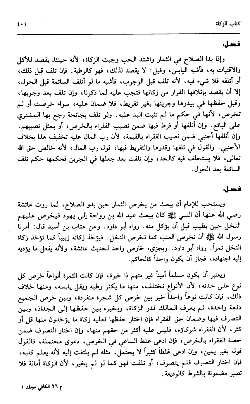 وإذا بدا الصلاح في الثمار واشتد الحب وجبت الزكاة؛ لأنه حينئذ يقصد للأكل والاقتيات به، فأشبه اليابس، وقيل: لا يقصد لذلك، فهو كالرطبة. فإن تلف قبل ذلك، أو أتلفه فلا شيء فيه؛ لأنه تلف قبل الوجوب، فأشبه ما لو أتلف السائمة قبل الحول، إلا أن يقصد بإتلافها الفرار من زكاتها فتجب عليه لما ذكرنا، وإن تلف بعد وجوبها، وقبل حفظها في بيدرها وجرينها بغير تفريط، فلا ضمان عليه، سواء خرصت أو لم تخرص؛ لأنها في حكم ما لم تثبت اليد عليه. ولو تلف بجائحة رجع بها المشتري على البائع. وإن أتلفها أو فرط فيها ضمن نصيب الفقراء بالخرص، أو بمثل نصيبهم. وإن أتلفها أجنبي ضمن نصيب الفقراء بالقيمة؛ لأن رب المال عليه تخفيف هذا بخلاف الأجنبي. والقول في تلفها وقدرها والتفريط فيها، قول رب المال؛ لأنه خالص حق الله تعالى، فلا يستحلف فيه كالحد، وإن تلف بعد جعلها في الجرين فحكمها حكم تلف السائمة بعد الحول.
