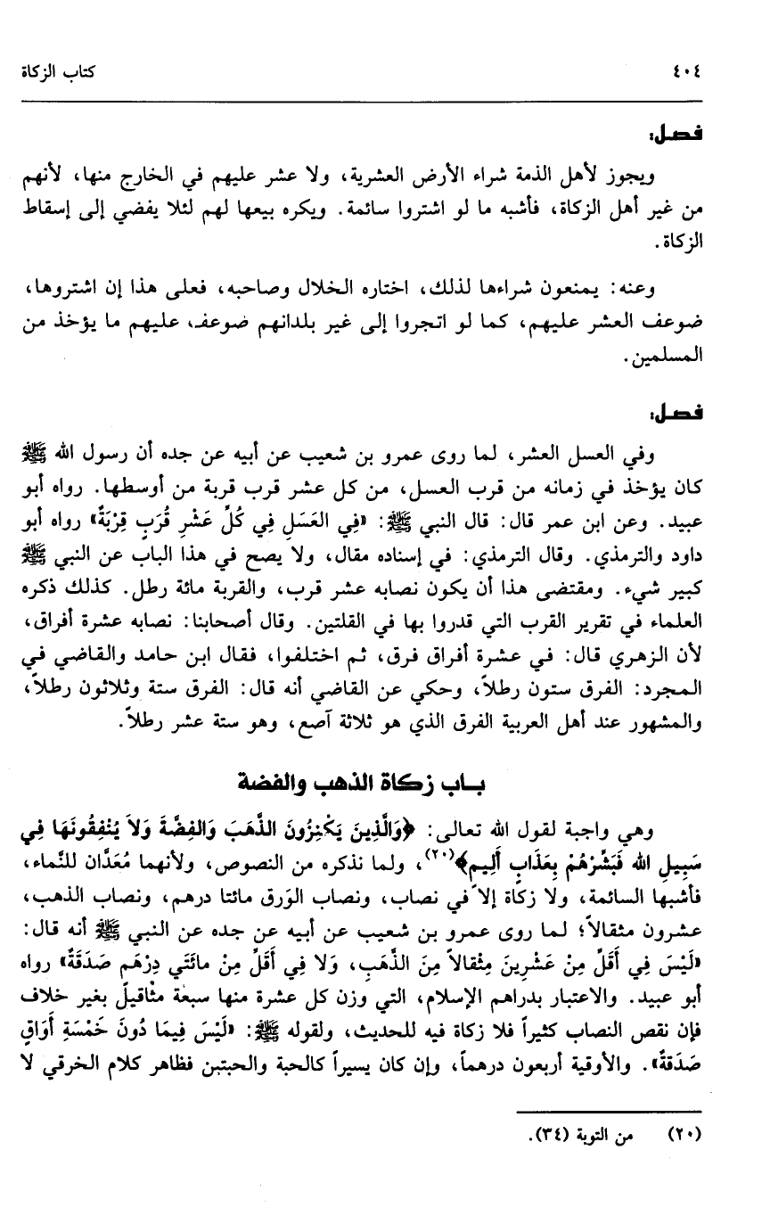 والفضة وهي واجبة لقول الله تعالى: {وَالَّذِينَ يَكْنِزُونَ الذَّهَبَ وَالْفِضَّةَ وَلا يُنْفِقُونَهَا فِي سَبِيلِ اللَّهِ فَبَشِّرْهُمْ بِعَذَابٍ أَلِيمٍ} [التوبة: 34] ، ولما نذكره من النصوص، ولأنهما معدان للنماء، فأشبها السائمة، ولا زكاة إلا في نصاب، ونصاب الورق مائتا درهم، ونصاب الذهب، عشرون مثقالاً؛ لما روى عمرو بن شعيب عن أبيه عن جده عن النبي - صَلَّى اللَّهُ عَلَيْهِ وَسَلَّمَ - أنه قال: «ليس في أقل من عشرين مثقالاً من الذهب، ولا أقل من مائتي درهم صدقة» رواه أبو عبيد. والاعتبار بدراهم الإسلام، التي وزن كل عشر منها سبعة مثاقيل بغير خلاف فإن نقص النصاب كثيراً فلا زكاة فيه للحديث، ولقوله - صَلَّى اللَّهُ عَلَيْهِ وَسَلَّمَ -: «ليس فيما دون خمسة أواق صدقة» . والأوقية أربعون درهماً، وإن كان يسيراً كالحبة والحبتين فظاهر كلام الخرقي لا