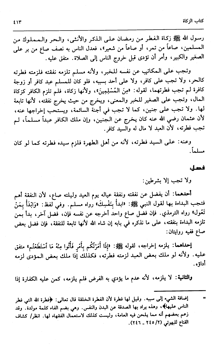 وتجب على المكاتب عن نفسه للخبر، ولأنه مسلم تلزمه نفقته فلزمته فطرته كالحر، ولا تجب على كافر، ولا على أحد بسببه، فلو كان للمسلم عبد كافر أو زوجة كافرة لم تجب فطرتهما، لقوله: «من المسلمين» ، ولأنها زكاة، فلم تلزم الكافر كزكاة المال، وتجب على الصغير للخبر والمعنى، ويخرج من حيث يخرج نفقته؛ لأنها تابعة لها. ولا تجب على جنين، كما لا تجب على أجنة السائمة، ويستحب إخراجها عنه؛ لأن عثمان - رَضِيَ اللَّهُ عَنْهُ - كان يخرج عن الجنين، وإن ملك الكافر عبداً مسلماً، لم تجب فطرته؛ لأن العبد لا مال له والسيد كافر.