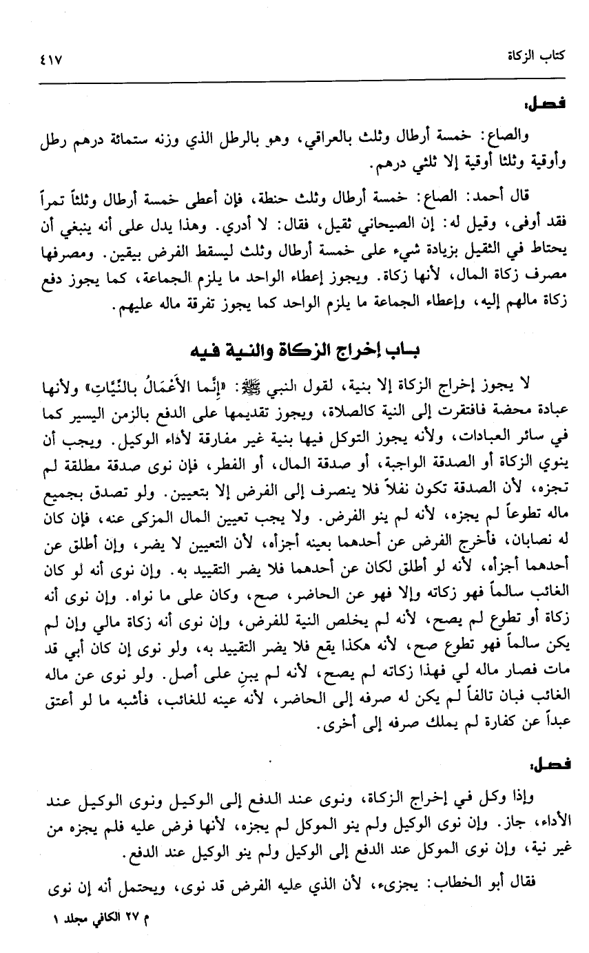 لا يجوز إخراج الزكاة إلا بنية، لقول النبي - صَلَّى اللَّهُ عَلَيْهِ وَسَلَّمَ -: «إنما الأعمال بالنيات» ولأنها عبادة محضة فافتقرت إلى النية كالصلاة، ويجوز تقديمها على الدفع بالزمن اليسير كما في سائر العبادات، ولأنه يجوز التوكل فيها بنية غير مفارقة لأداء الوكيل. ويجب أن ينوي الزكاة أو الصدقة الواجبة، أو صدقة المال، أو الفطر، فإن نوى صدقة مطلقة لم تجزه؛ لأن الصدقة تكون نفلاً فلا ينصرف إلى الفرض إلا بتعيين، ولو تصدق بجميع ماله تطوعاً لم يجزه؛ لأنه لم ينو الفرض. ولا يجب تعيين المال المزكى عنه، فإن كان له نصابان، فأخرج الفرض عن أحدهما بعينه أجزأه؛ لأن التعيين لا يضر، وإن أطلق عن أحدهما أجزأه؛ لأنه لو أطلق لكان عن أحدهما فلا يضر التقييد به. وإن نوى أنه لو كان الغائب سالماً فهو زكاته وإلا فهو عن الحاضر، صح، وكان على ما نواه. وإن نوى أنه زكاة أو تطوع لم يصح؛ لأنه لم يخلص النية للفرض، وإن نوى أنه زكاة مالي وإن لم يكن سالماً فهو تطوع صح؛ لأنه هكذا يقع فلا يضر التقييد به، ولو نوى إن كان أبي قد مات فصار ماله لي فهذا زكاته لم يصح؛ لأنه لم يبن على أصل. ولو نوى عن ماله الغائب فبان تالفاً لم يكن له صرفه إلى الحاضر؛ لأنه عينه للغائب، فأشبه ما لو أعتق عبداً عن كفارة لم يملك صرفه إلى أخرى.