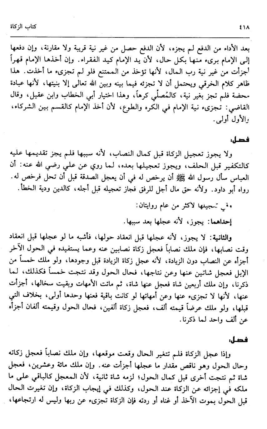 ولا يجوز تعجيل الزكاة قبل كمال النصاب؛ لأنه سببها فلم يجز تقديمها عليه كالتكفير قبل الحلف، ويجوز تعجيلها بعده، لما روي عن علي - رَضِيَ اللَّهُ عَنْهُ -: «أن العباس سأل رسول الله - صَلَّى اللَّهُ عَلَيْهِ وَسَلَّمَ - أن يرخص له في أن يعجل الصدقة قبل أن تحل فرخص له» . رواه أبو داود. ولأنه حق مال أجل للرفق فجاز تعجيله قبل أجله، كالدين ودية الخطأ.