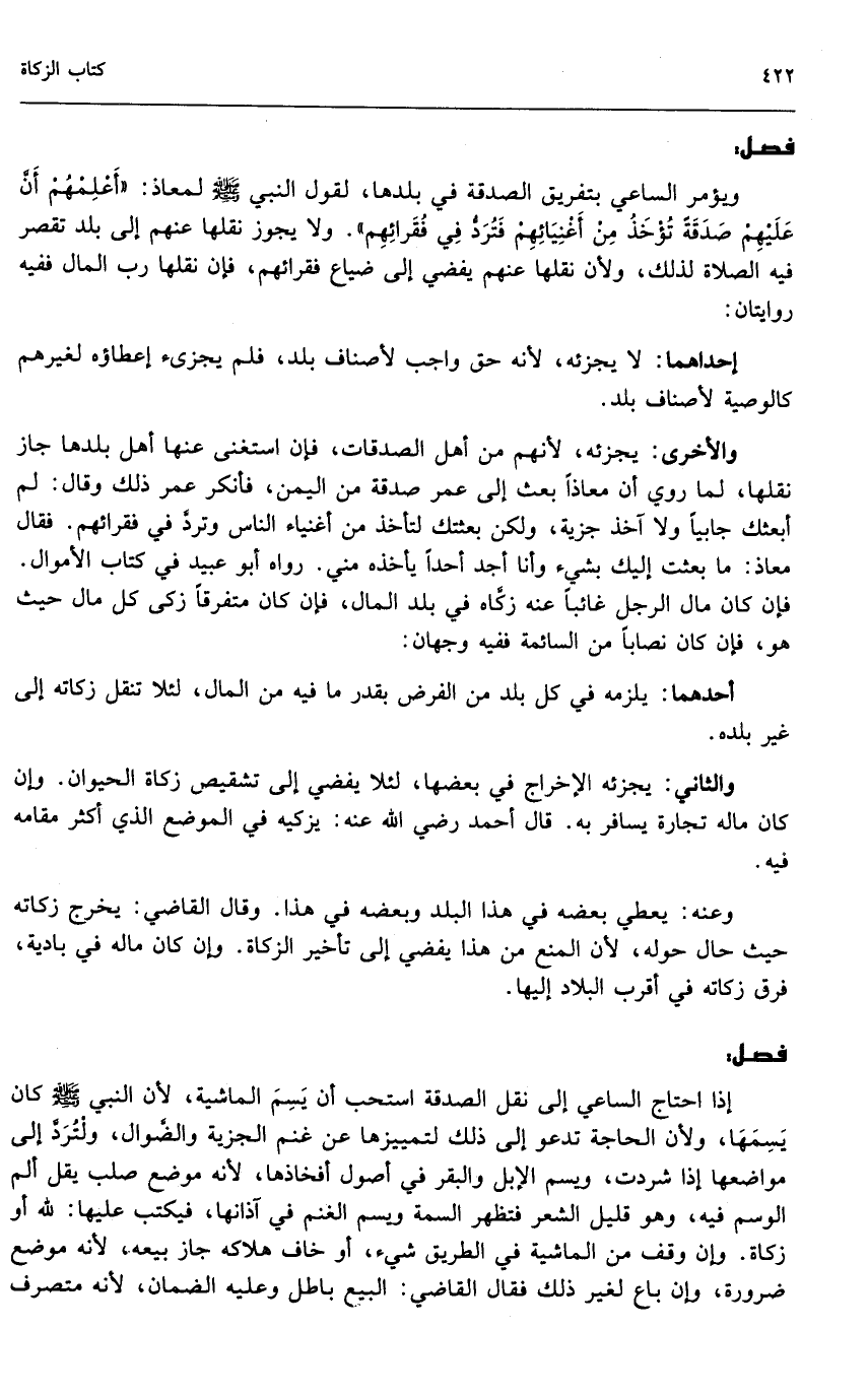 والأخرى: يجزئه؛ لأنهم من أهل الصدقات، فإن استغنى عنها أهل بلدها جاز نقلها، لما روي أن معاذاً بعث إلى عمر صدقة من اليمن، فأنكر عمر ذلك وقال: لم أبعثك جابياً ولا آخذ جزية، ولكن بعثتك لتأخذ من أغنياء الناس وترد في فقرائهم. فقال معاذ: ما بعثت إليك بشيء وأنا أجد أحداً يأخذه مني. رواه أبو عبيد في كتاب الأموال. فإن كان مال الرجل غائباً عنه زكاه في بلد المال، فإن كان متفرقاً زكى كل مال حيث هو، فإن كان نصاباً من السائمة ففيه وجهان: