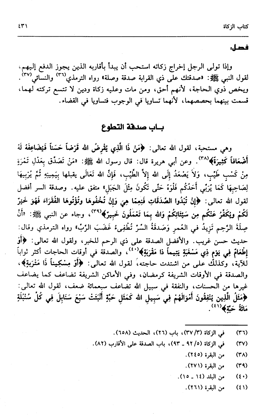 وهي مستحبة، لقول الله تعالى: {مَنْ ذَا الَّذِي يُقْرِضُ اللَّهَ قَرْضًا حَسَنًا فَيُضَاعِفَهُ لَهُ أَضْعَافًا كَثِيرَةً} [البقرة: 245] وعن أبي هريرة قال: قال رسول الله - صَلَّى اللَّهُ عَلَيْهِ وَسَلَّمَ -: «من تصدق بعدل تمرة من كسب طيب، ولا يصعد إلى الله إلا الطيب، فإن الله تعالى يقبلها بيمينه ثم يربيها لصاحبها كما يربي أحدكم فلوه حتى تكون مثل الجبل» متفق عليه. وصدقة السر أفضل لقول الله تعالى: {إِنْ تُبْدُوا الصَّدَقَاتِ فَنِعِمَّا هِيَ وَإِنْ تُخْفُوهَا وَتُؤْتُوهَا الْفُقَرَاءَ فَهُوَ خَيْرٌ لَكُمْ وَيُكَفِّرُ عَنْكُمْ مِنْ سَيِّئَاتِكُمْ وَاللَّهُ بِمَا تَعْمَلُونَ خَبِيرٌ} [البقرة: 271] ، وجاء عن النبي - صَلَّى اللَّهُ عَلَيْهِ وَسَلَّمَ -: «أن صلة الرحم تزيد في العمر وصدقة السر تطفئ غضب الرب» رواه الترمذي وقال: حديث حسن غريب. والأفضل الصدقة على ذي الرحم للخبر، ولقول الله تعالى: {أَوْ إِطْعَامٌ فِي يَوْمٍ ذِي مَسْغَبَةٍ} [البلد: 14] {يَتِيمًا ذَا مَقْرَبَةٍ} [البلد: 15] ، والصدقة في أوقات الحاجة أكثر ثواباً للآية، وكذلك على من اشتدت حاجته، لقول الله تعالى: {أَوْ مِسْكِينًا ذَا مَتْرَبَةٍ} [البلد: 16] والصدقة في الأوقات الشريفة كرمضان، وفي الأماكن الشريفة تضاعف كما يضاعف غيرها من الحسنات، والنفقة في سبيل الله تضاعف سبعمائة ضعف، لقول الله تعالى: {مَثَلُ الَّذِينَ يُنْفِقُونَ أَمْوَالَهُمْ فِي سَبِيلِ اللَّهِ كَمَثَلِ حَبَّةٍ أَنْبَتَتْ سَبْعَ سَنَابِلَ فِي كُلِّ سُنْبُلَةٍ مِائَةُ حَبَّةٍ} [البقرة: 261] .