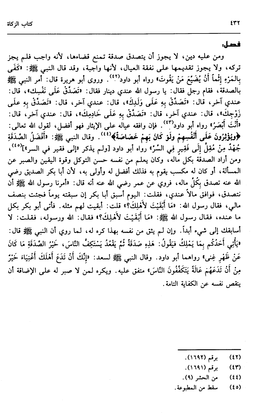 ومن عليه دين، لا يجوز أن يتصدق صدقة تمنع قضاءها؛ لأنه واجب فلم يجز تركه، ولا يجوز تقديمها على نفقة العيال؛ لأنها واجبة، وقد قال النبي - صَلَّى اللَّهُ عَلَيْهِ وَسَلَّمَ -: «كفى بالمرء إثماً أن يضيع من يقوت» رواه أبو داود. وروى أبو هريرة قال: «أمر النبي - صَلَّى اللَّهُ عَلَيْهِ وَسَلَّمَ - بالصدقة، فقام رجل فقال: يا رسول الله عندي دينار فقال: تصدق على نفسك، قال: عندي آخر، قال: تصدق به على ولدك، قال: عندي آخر، قال: تصدق به على زوجك، قال: عندي آخر، قال: تصدق به على خادمك، قال: عندي آخر، قال: أنت أبصر» رواه أبو داود. فإن وافقه عياله على الإيثار فهو أفضل، لقول الله تعالى: {وَيُؤْثِرُونَ عَلَى أَنْفُسِهِمْ وَلَوْ كَانَ بِهِمْ خَصَاصَةٌ} [الحشر: 9] وقال النبي - صَلَّى اللَّهُ عَلَيْهِ وَسَلَّمَ -: «أفضل الصدقة جهد من مقل إلى فقير في السر» رواه أبو داود [ولم يذكر (إلى فقير في السر) ] ، ومن أراد الصدقة بكل ماله، وكان يعلم من نفسه حسن التوكل وقوة اليقين والصبر عن المسألة، أو كان له مكسب يقوم به فذلك أفضل له وأولى به؛ لأن أبا بكر الصديق - رَضِيَ اللَّهُ عَنْهُ - تصدق بكل ماله، فروي عن عمر - رَضِيَ اللَّهُ عَنْهُ - أنه قال: «أمرنا رسول الله - صَلَّى اللَّهُ عَلَيْهِ وَسَلَّمَ - أن نتصدق، فوافق مالا عندي، فقلت: اليوم أسبق أبا بكر إن سبقته يوماً فجئت بنصف مالي، فقال رسول الله - صَلَّى اللَّهُ عَلَيْهِ وَسَلَّمَ -: ما أبقيت لأهلك؟ قلت: أبقيت لهم مثله. فأتى أبو بكر بكل ما عنده، فقال رسول الله - صَلَّى اللَّهُ عَلَيْهِ وَسَلَّمَ -: ما أبقيت لأهلك؟ فقال: الله ورسوله، فقلت لا أسابقك إلى شي أبداً» ، وإن لم يثق من نفسه بهذا كره له، لما روي أن النبي - صَلَّى اللَّهُ عَلَيْهِ وَسَلَّمَ - قال: «يأتي أحدكم بما يملك فيقول: هذه صدقة ثم يقعد يستكف الناس، خير الصدقة ما كان عن ظهر غنى» رواهما أبو داود. وقال النبي - صَلَّى اللَّهُ عَلَيْهِ وَسَلَّمَ - لسعد: «إنك أن تدع أهلك أغنياء خير من أن تدعهم عالةً يتكففون الناس» متفق عليه. ويكره لمن لا صبر له على الإضاقة أن ينقص نفسه عن الكفاية التامة.