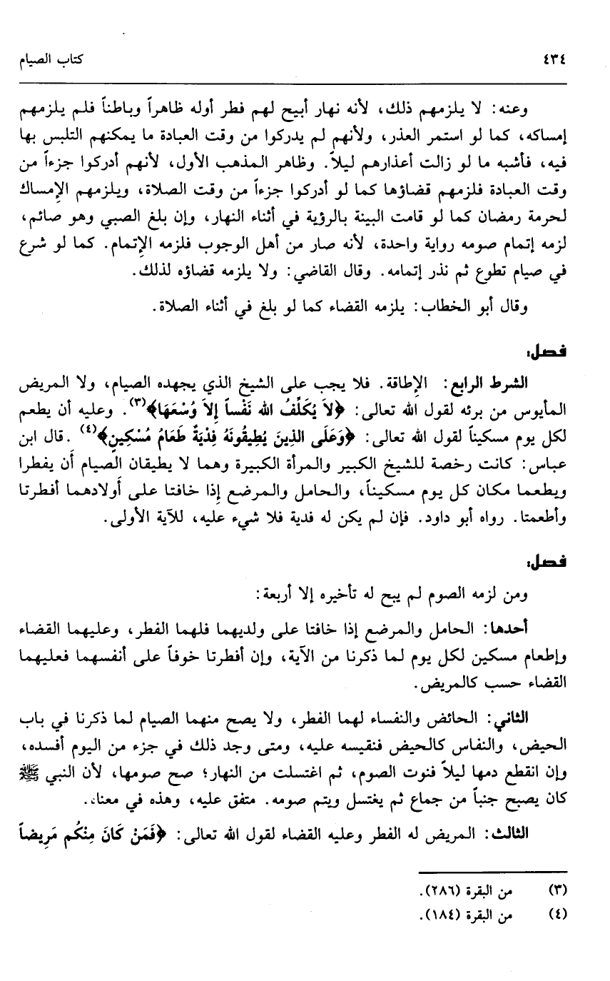 الشرط الرابع: الإطاقة، فلا يجب على الشيخ الذي يجهده الصيام، ولا المريض المأيوس من برئه لقول الله تعالى: {لا يُكَلِّفُ اللَّهُ نَفْسًا إِلا وُسْعَهَا} [البقرة: 286] . وعليه أن يطعم لكل يوم مسكيناً لقول الله تعالى: {وَعَلَى الَّذِينَ يُطِيقُونَهُ فِدْيَةٌ طَعَامُ مِسْكِينٍ} [البقرة: 184] . قال ابن عباس: كانت رخصة للشيخ الكبير والمرأة الكبيرة وهما لا يطيقان الصيام أن يفطرا ويطعما مكان كل يوم مسكيناً، والحامل والمرضع إذا خافتا على أولادهما أفطرتا وأطعمتا. رواه أبو داود. فإن لم يكن له فدية فلا شيء عليه، للآية الأولى.
