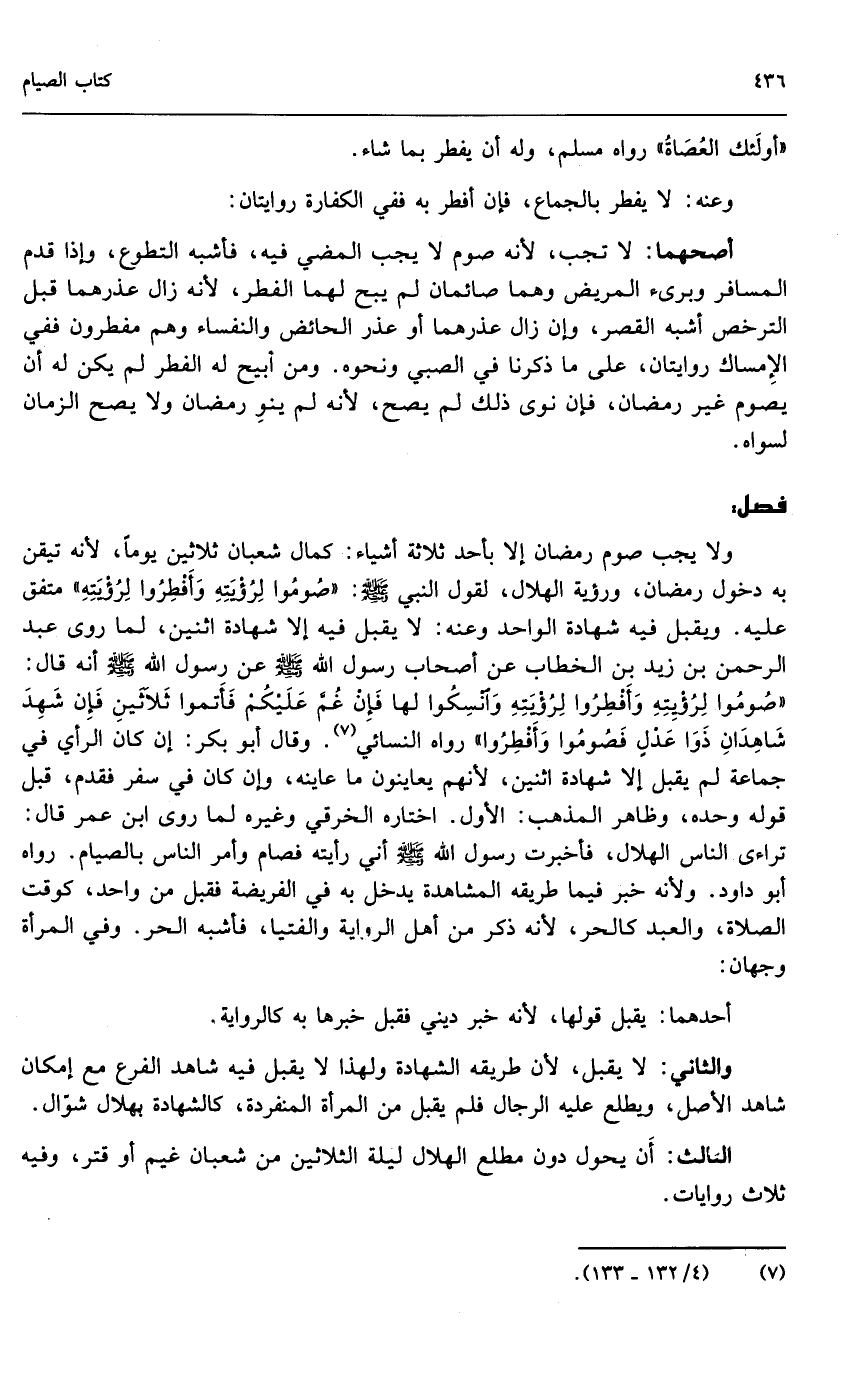 ولا يجب صوم رمضان إلا بأحد ثلاثة أشياء: كمال شعبان ثلاثين يوماً؛ لأنه تيقن به دخول رمضان، ورؤية الهلال، لقول النبي - صَلَّى اللَّهُ عَلَيْهِ وَسَلَّمَ -: «صوموا لرؤيته وأفطروا لرؤيته» متفق عليه. ويقبل فيه شهادة الواحد وعنه: لا يقبل فيه إلا شهادة اثنين، لما روى عبد الرحمن بن زيد بن الخطاب عن أصحاب رسول الله - صَلَّى اللَّهُ عَلَيْهِ وَسَلَّمَ - عن رسول الله - صَلَّى اللَّهُ عَلَيْهِ وَسَلَّمَ - أنه قال: «صوموا لرؤيته وأفطروا لرؤيته وانسكوا لها فإن غم عليكم فأتموا ثلاثين فإن شهد شاهدان ذوا عدل فصوموا وأفطروا» رواه النسائي. وقال أبو بكر: إن كان الرأي في جماعة لم يقبل إلا شهادة اثنين؛ لأنهم يعاينون ما عاينه، وإن كان في سفر فقدم، قبل قوله وحده، وظاهر المذهب: الأول. اختاره الخرقي وغيره لما روى ابن عمر قال: «تراءى الناس الهلال، فأخبرت رسول الله - صَلَّى اللَّهُ عَلَيْهِ وَسَلَّمَ - أني رأيته فصام وأمر الناس بالصيام» . رواه أبو داود. ولأنه خبر فيما طريقه المشاهدة يدخل به في الفريضة فقبل من واحد، كوقت الصلاة، والعبد كالحر؛ لأنه ذكر من أهل الرواية والفتيا، فأشبه الحر. وفي المرأة وجهان: