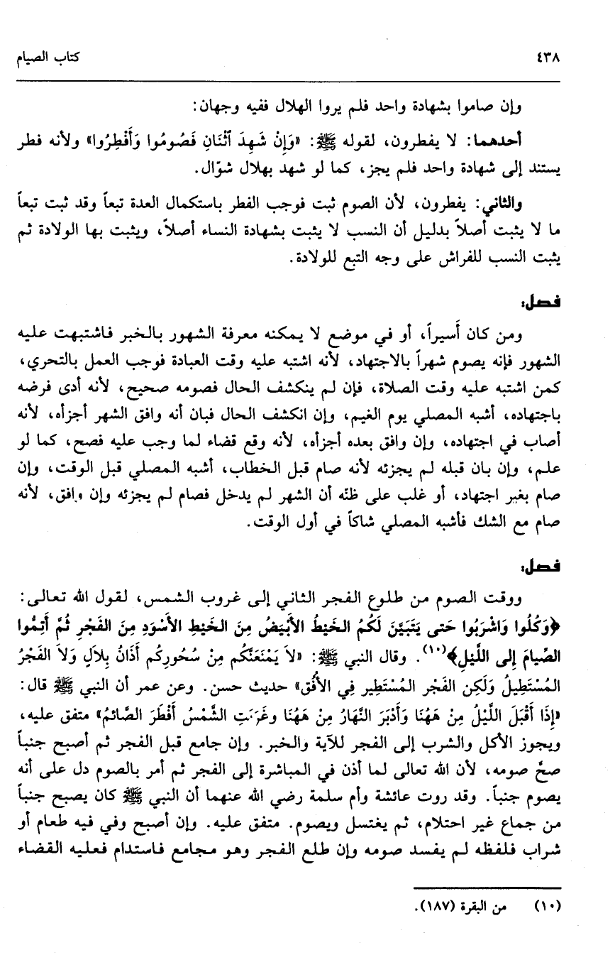 ووقت الصوم من طلوع الفجر الثاني إلى غروب الشمس، لقول الله تعالى: {وَكُلُوا وَاشْرَبُوا حَتَّى يَتَبَيَّنَ لَكُمُ الْخَيْطُ الأَبْيَضُ مِنَ الْخَيْطِ الأَسْوَدِ مِنَ الْفَجْرِ ثُمَّ أَتِمُّوا الصِّيَامَ إِلَى اللَّيْلِ} [البقرة: 187] . وقال النبي - صَلَّى اللَّهُ عَلَيْهِ وَسَلَّمَ -: «لا يمنعنكم من سحوركم أذان بلال ولا الفجر المستطيل ولكن الفجر المستطير في الأفق» حديث حسن. وعن عمر أن النبي - صَلَّى اللَّهُ عَلَيْهِ وَسَلَّمَ - قال: «إذا أقبل الليل من ههنا وأدبر النهار من ههنا وغربت الشمس أفطر الصائم» متفق عليه، ويجوز الأكل والشرب إلى الفجر للآية والخبر.