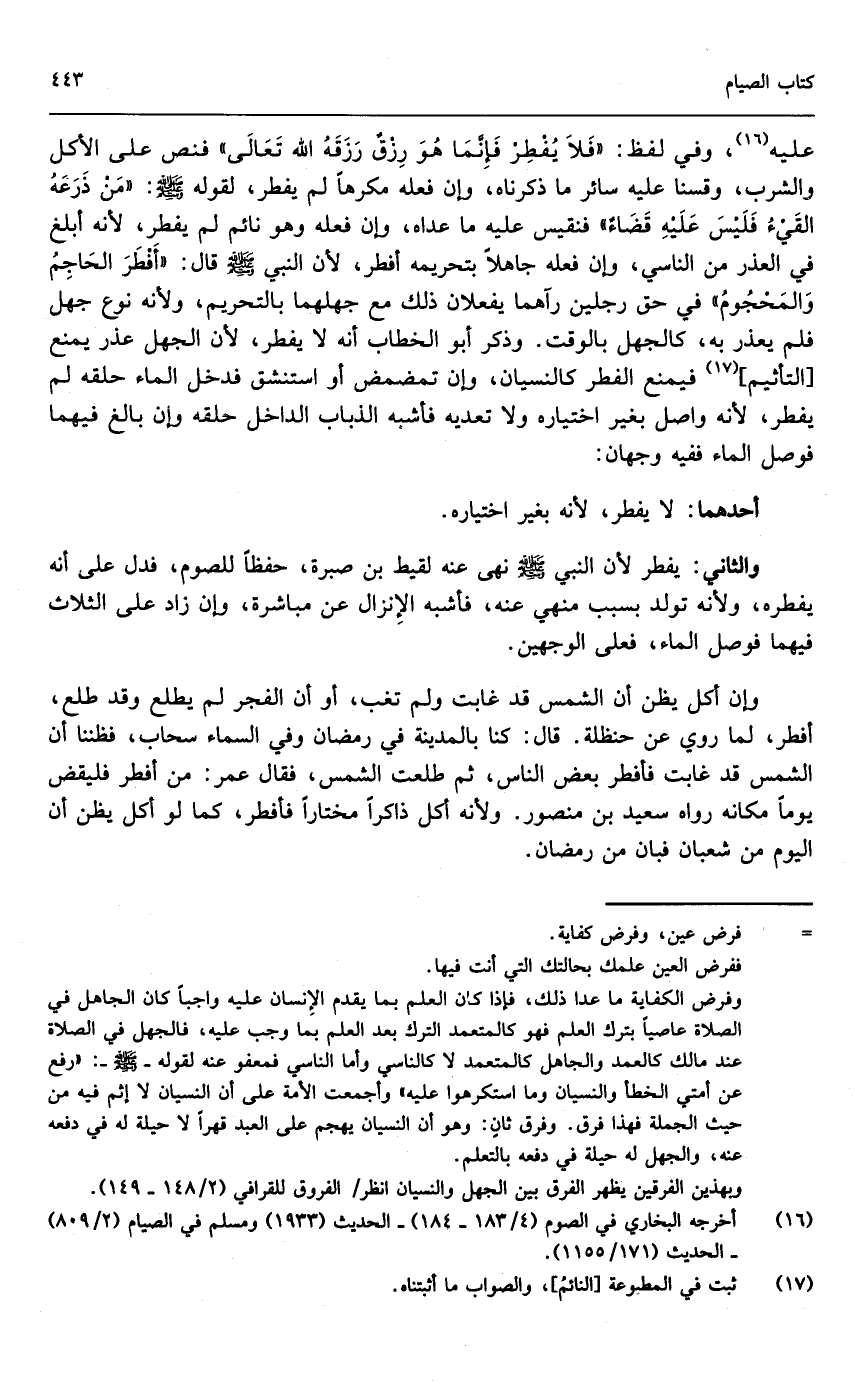 عليه، وفي لفظ: «فلا يفطر فإنما هو رزق رزقه الله تعالى» فنص على الأكل والشرب، وقسنا عليه سائر ما ذكرناه، وإن فعله مكرهاً لم يفطر، لقوله - صَلَّى اللَّهُ عَلَيْهِ وَسَلَّمَ -: «من ذرعه القيء فليس عليه قضاء» فنقيس عليه ما عداه، وإن فعله وهو نائم لم يفطر؛ لأنه أبلغ في العذر من الناسي، وإن فعله جاهلاً بتحريمه أفطر؛ لأن النبي - صَلَّى اللَّهُ عَلَيْهِ وَسَلَّمَ - قال: «أفطر الحاجم والمحجوم» في حق رجلين رآهما يفعلان ذلك مع جهلهما بالتحريم، ولأنه نوع جهل فلم يعذر به، كالجهل بالوقت، وذكر أبو الخطاب أنه لا يفطر؛ لأن الجهل عذر يمنع [التأثيم] فيمنع الفطر كالنسيان، وإن تمضمض أو استنشق فدخل الماء حلقه لم يفطر؛ لأنه واصل بغير اختياره ولا تعديه فأشبه الذباب الداخل حلقه وإن بالغ فيهما فوصل الماء ففيه وجهان: