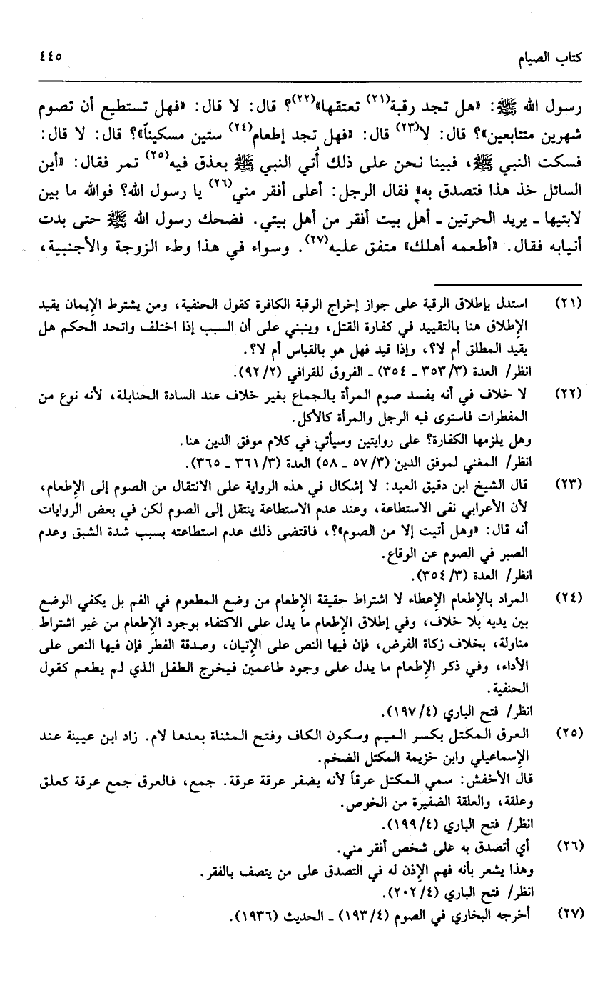 رسول الله - صَلَّى اللَّهُ عَلَيْهِ وَسَلَّمَ -: هل تجد رقبة تعتقها؟ قال: لا قال: فهل تستطيع أن تصوم شهرين متتابعين؟ قال: لا، قال: فهل تجد إطعام ستين مسكيناً؟ قال: لا، قال: فسكت النبي - صَلَّى اللَّهُ عَلَيْهِ وَسَلَّمَ -، فبينا نحن على ذلك أتي النبي - صَلَّى اللَّهُ عَلَيْهِ وَسَلَّمَ - بعذق فيه تمر فقال: أين السائل خذ هذا فتصدق به فقال الرجل: أعلى أفقر مني يا رسول الله؟ فوالله ما بين لابتيها - يريد الحرتين - أهل بيت أفقر من أهل بيتي. فضحك رسول الله - صَلَّى اللَّهُ عَلَيْهِ وَسَلَّمَ - حتى بدت أنيابه فقال: أطعمه أهلك» متفق عليه. وسواء في هذا وطء الزوجة والأجنبية،