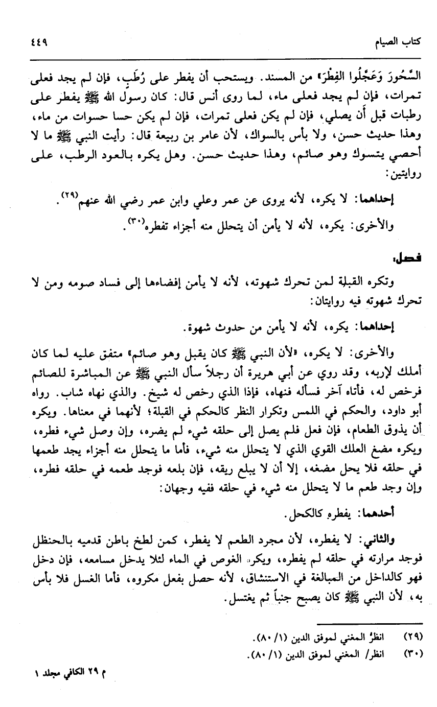 السحور وعجلوا الفطور» من المسند. ويستحب أن يفطر على رطب، فإن لم يجد فعلى تمرات، فإن لم يجد فعلى ماء، لما روى أنس قال: «كان رسول الله - صَلَّى اللَّهُ عَلَيْهِ وَسَلَّمَ - يفطر على رطبات قبل أن يصلي، فإن لم يكن فعلى تمرات، فإن لم يكن حسا حسوات من ماء» ، وهذا حديث حسن، ولا بأس بالسواك؛ لأن عامر بن ربيعة قال: «رأيت النبي - صَلَّى اللَّهُ عَلَيْهِ وَسَلَّمَ - ما لا أحصي يتسوك وهو صائم» ، وهذا حديث حسن. وهل يكره بالعود الرطب، على روايتين: