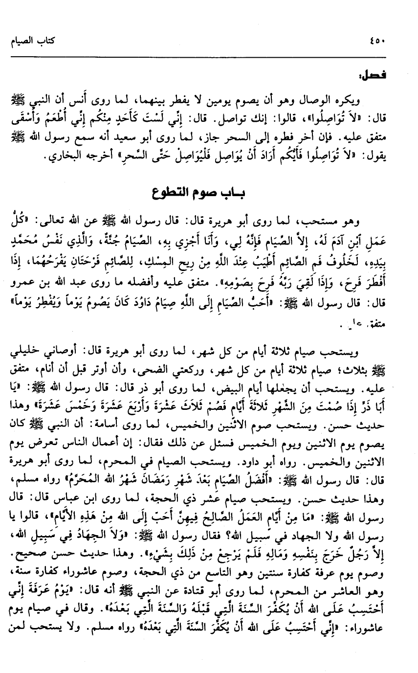 ويستحب صيام ثلاثة أيام من كل شهر، لما روى أبو هريرة قال: «أوصاني خليلي - صَلَّى اللَّهُ عَلَيْهِ وَسَلَّمَ - بثلاث؛ صيام ثلاث أيام من كل شهر، وركعتي الضحى، وأن أوتر قبل أن أنام» ، متفق عليه. ويستحب أن يجعلها أيام البيض، لما روى أبو ذر قال: قال رسول الله - صَلَّى اللَّهُ عَلَيْهِ وَسَلَّمَ -: «يا أبا ذر إذا صمت من الشهر ثلاثة أيام فصم ثلاث عشرة وأربع عشرة وخمس عشرة» وهذا حديث حسن، ويستحب صوم الاثنين والخميس، لما روى أسامة «أن النبي - صَلَّى اللَّهُ عَلَيْهِ وَسَلَّمَ - كان يصوم يوم الاثنين ويوم الخميس فسئل عن ذلك فقال: إن أعمال الناس تعرض يوم الاثنين والخميس» . رواه أبو داود. ويستحب الصيام في المحرم، لما روى أبو هريرة قال: قال رسول الله - صَلَّى اللَّهُ عَلَيْهِ وَسَلَّمَ -: «أفضل الصيام بعد شهر رمضان شهر الله المحرم» رواه مسلم، وهذا حديث حسن. ويستحب صيام عشر ذي الحجة، لما روى ابن عباس قال: قال رسول الله - صَلَّى اللَّهُ عَلَيْهِ وَسَلَّمَ -: «ما من أيامٍ العملُ الصالح فيهن أحب إلى الله من هذه الأيام قالوا يا رسول الله ولا الجهاد في سبيل الله؟ فقال رسول الله - صَلَّى اللَّهُ عَلَيْهِ وَسَلَّمَ -: ولا الجهاد في سبيل الله، إلا رجل خرج بنفسه وماله فلم يرجع من ذلك بشيء» وهذا حديث حسن صحيح. وصوم يوم عرفة كفارة سنتين وهو التاسع من ذي الحجة، وصوم عاشوراء كفارة سنة، وهو العاشر من المحرم، لما روى أبو قتادة عن النبي - صَلَّى اللَّهُ عَلَيْهِ وَسَلَّمَ - أنه قال: «يوم عرفة إني أحتسب على الله أن يكفر السنة التي قبله والسنة التي بعده» وقال في صيام يوم عاشوراء: «إني أحتسب على الله أن يكفر السنة التي بعده» رواه مسلم.