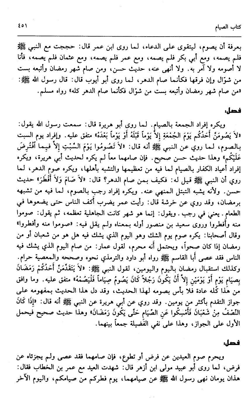 ويكره إفراد الجمعة بالصيام. لما روى أبو هريرة قال: سمعت رسول الله - صَلَّى اللَّهُ عَلَيْهِ وَسَلَّمَ - يقول: «لَا يَصُومَنَّ أَحَدُكُمْ يَوْمَ الْجُمُعَةَ إِلَّا يَوْمًا قَبْلَهُ أَوْ يَوْمًا بَعْدَهُ» متفق عليه. وإفراد يوم السبت بالصوم؛ لما روي عن النبي - صَلَّى اللَّهُ عَلَيْهِ وَسَلَّمَ - أنه قال: «لَا تَصُومُوا يَوْمَ السَّبْتِ إِلَّا فِيمَا افْتُرِضَ عَلَيْكُمْ» وهذا حديث حسن صحيح. فإن صامهما معًا لم يكره لحديث أبي هريرة، ويكره إفراد أعياد الكفار بالصيام لما فيه من تعظيمها، والتشبه بأهلها، ويكره صوم الدهر؛ لما روي أن النبي - صَلَّى اللَّهُ عَلَيْهِ وَسَلَّمَ - قيل له: فكيف بمن صام الدهر؟ قال: «لا صام ولا أفطر» حديث حسن؛ ولأنه يشبه التبتل المنهي عنه. ويكره إفراد رجب بالصوم؛ لما فيه من تشبهه برمضان، وقد روي عن خرشة قال: رأيت عمر يضرب أكف الناس حتى يضعوها في الطعام. يعني في رجب. ويقول: إنما هو شهر كانت الجاهلية تعظمه، ثم يقول: صوموا منه، وأفطروا، وروى سعيد بن منصور أوله بمعناه، ولم يقل فيه: " صوموا منه وأفطروا ". وقال أصحابنا: يكره صوم يوم الشك وهو اليوم الذي يُشَكُّ فيه هل هو من شعبان أو من رمضان إذا كان صحوًا، ويحتمل أنه محرم؛ لقول عمار: «من صام اليوم الذي يشك فيه الناس فقد عصى أبا القاسم - صَلَّى اللَّهُ عَلَيْهِ وَسَلَّمَ -» - رواه أبو داود والترمذي نحوه، وصححه والمعصية حرام.