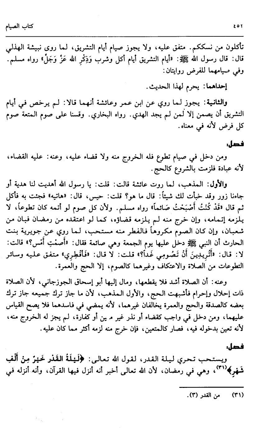 تأكلون من نسككم.» متفق عليه، ولا يجوز صيام أيام التشريق؛ لما روى نبيشة الهذلي قال: قال رسول الله - صَلَّى اللَّهُ عَلَيْهِ وَسَلَّمَ -: «أيام التشريق أيام أكل وشرب وذكر الله عز وجل» رواه مسلم. وفي صيامهما للفرض روايتان: