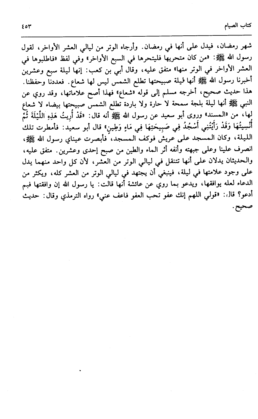 شهر رمضان، فيدل على أنها في رمضان. وأرجاه الوتر في ليالي العشر الأواخر؛ لقول رسول الله - صَلَّى اللَّهُ عَلَيْهِ وَسَلَّمَ -: «من كان متحريها فليتحرها في السبع الأواخر» وفي لفظ: «فاطلبوها في العشر الأواخر في الوتر منها» متفق عليه. وقال أبي بن كعب: إنها ليلة سبع وعشرين، «أخبرنا رسول الله - صَلَّى اللَّهُ عَلَيْهِ وَسَلَّمَ - أنها ليلة صبيحتها تطلع الشمس ليس لها شعاع. فعددنا وحفظنا» . هذا حديث صحيح، أخرجه مسلم إلى قوله ((شعاع)) ، فهذا أصح علاماتها، وقد روي عن النبي - صَلَّى اللَّهُ عَلَيْهِ وَسَلَّمَ - «أنها ليلة بلجة سمحة لا حارة ولا باردة، تطلع الشمس صبيحتها بيضاء لا شعاع لها» ، من " المسند "، وروى أبو سعيد عن رسول الله - صَلَّى اللَّهُ عَلَيْهِ وَسَلَّمَ - أنه قال: «قد أُرِيتُ هذه الليلة ثم أنسيتها، وقد رأيتني أسجد في صبيحتها في ماء وطين، قال أبو سعيد: فأمطرت تلك الليلة، وكان المسجد على عريش فوكف المسجد، فأبصرت عيناي رسول الله - صَلَّى اللَّهُ عَلَيْهِ وَسَلَّمَ - انصرف علينا وعلى جبهته وأنفه أثر الماء والطين من صبح إحدى وعشرين.» متفق عليه، والحديثان يدلان على أنها تتنقل في ليالي الوتر من العشر؛ لأن كل واحد منهما يدل على وجود علامتها في ليلة، فينبغي أن يجتهد في ليالي الوتر من العشر كله، ويكثر من الدعاء لعله يوافقها، ويدعو بما روي «عن عائشة أنها قالت: يا رسول الله إن وافقتها فبم أدعو؟ قال: قولي: اللهم إنك عفو تحب العفو فاعف عني» رواه الترمذي وقال: حديث صحيح.