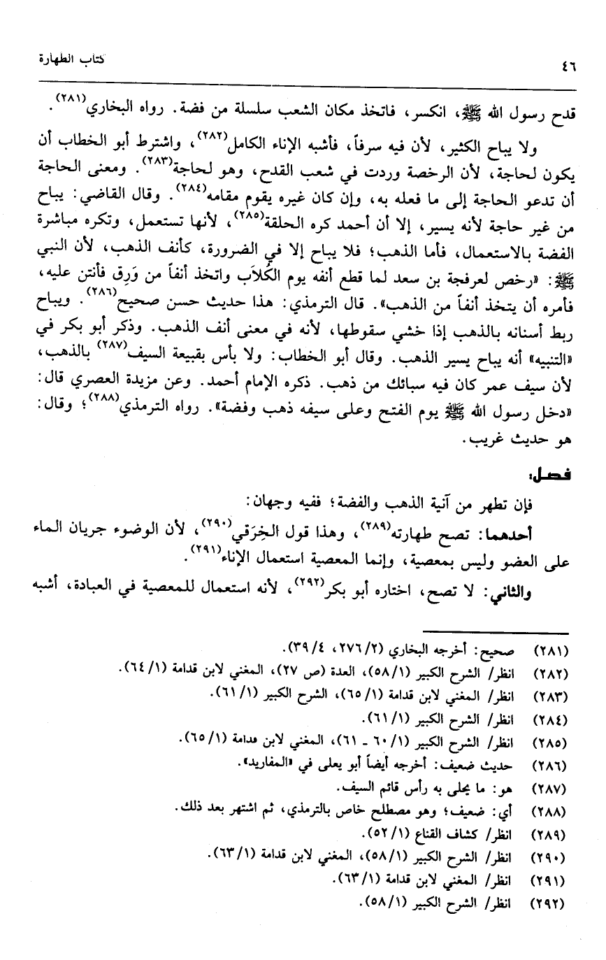 ولا يباح الكثير؛ لأن فيه سرفاً، فأشبه الإناء الكامل، واشترط أبو الخطاب أن يكون لحاجة؛ لأن الرخصة وردت في شعب القدح، وهو لحاجة. ومعنى الحاجة أن تدعو الحاجة إلى ما فعله به، وإن كان غيره يقوم مقامه. وقال القاضي: يباح من غير حاجة لأنه يسير، إلا أن أحمد كره الحلقة؛ لأنها تستعمل، وتكره مباشرة الفضة بالاستعمال، فأما الذهب، فلا يباح إلا في الضرورة، كأنف الذهب؛ لأن النبي - صَلَّى اللَّهُ عَلَيْهِ وَسَلَّمَ -: «رخص لعرفجة بن سعد لما قطع أنفه يوم الكلاب واتخذ أنفاً من ورق فأنتن عليه، فأمره أن يتخذ أنفاً من الذهب» . قال الترمذي: هذا حديث حسن صحيح. ويباح ربط أسنانه بالذهب إذا خشي سقوطها؛ لأنه في معنى أنف الذهب. وذكر أبو بكر في " التنبيه " أنه يباح يسير الذهب. وقال أبو الخطاب: ولا بأس بقبيعة السيف بالذهب؛ لأن سيف عمر كان فيه سبائك من ذهب. ذكره الإمام أحمد. وعن مزيدة العصري قال: «دخل رسول الله - صَلَّى اللَّهُ عَلَيْهِ وَسَلَّمَ - يوم الفتح وعلى سيفه ذهب وفضة» . رواه الترمذي، وقال: هو حديث غريب.